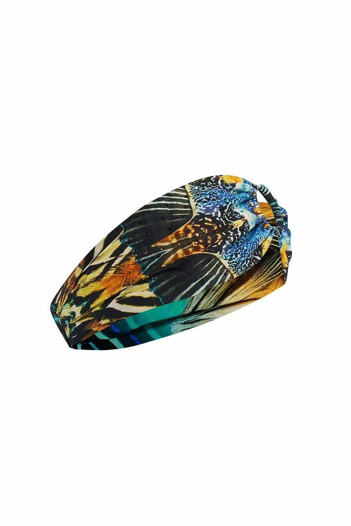 This youthful hair accessory features a printed silk wrap, gold animal embossed ring hardware, elasticated strap and luminous scattered crystals. Style over softly tousled beach waves for a goddess gypsy look.