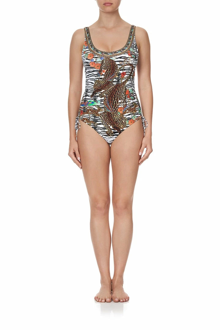 A retro-inspired statement swim one piece, the Cosmic Conflict Rouched One Piece is a sun chaser’s dream. Crafted with a soft printed Italian Nylon Elastane that depicts a cosmic conflict between Persian folklore against a poetic cream and floral canvas, this animal print one piece ideal for B-C chests features luxe hand-applied CAMILLA crystals, removable soft cups, adjustable retro rouched shoulders and hips to fit all forms whilst offering chest support. All CAMILLA swim pieces are crafted with love to last and retains both colour and shape beautifully. To care for your CAMILLA swim piece, simply cold hand wash. Designed to be worn with matching Oversized Robe for a mesmerising resort look.