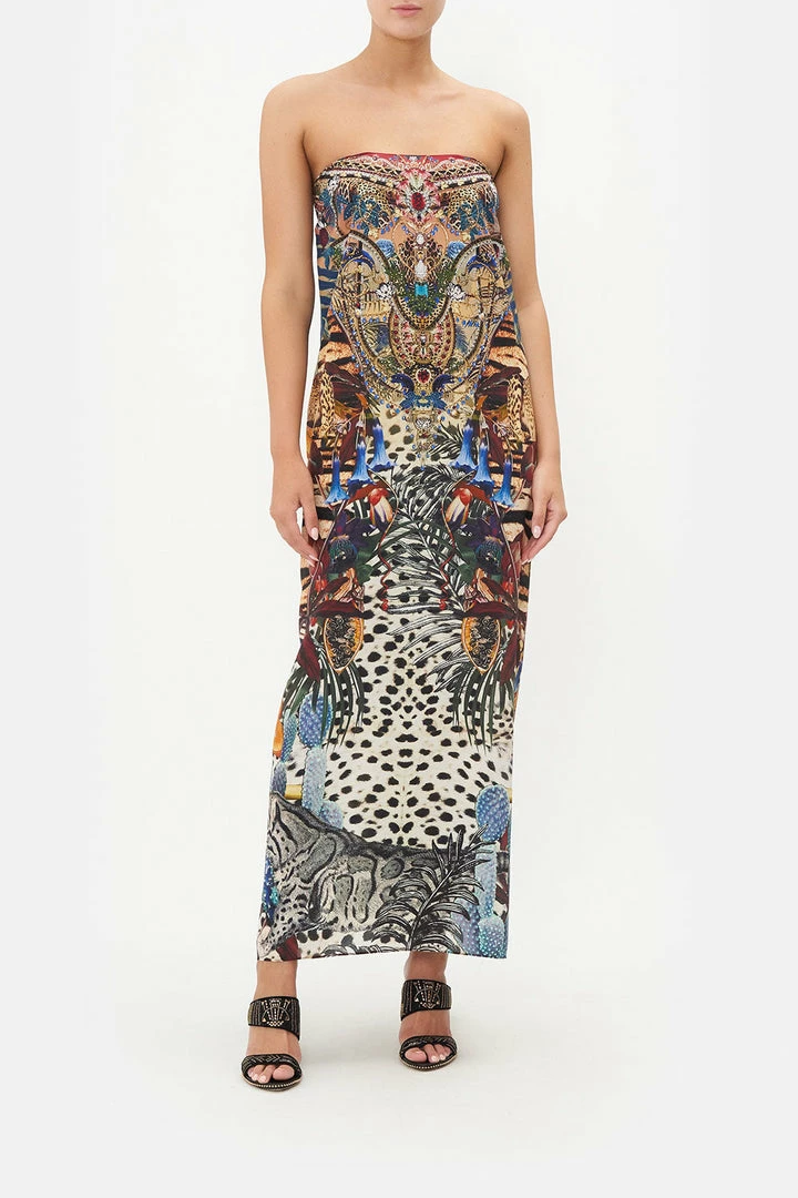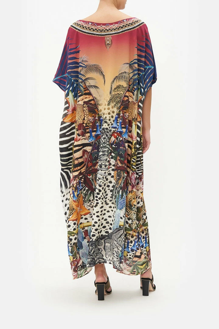 Signature resort wear immersed in the richness of Pachamama, our Natural Instinct Round Neck Kaftan is wrapped in a soft sunset scene enveloped by slated bluebells, cheetah print, ferns of paradise and striking big cat portraits. Adorned with hand-embellished crystals, this luxury silk kaftan features a generous rounded neckline, cropped sleeves and a relaxed maxi silhouette. With so many ways to wear, transform your kaftan into mini dresses, luxury layers, maxi skirts and shapes of Grecian proportions.