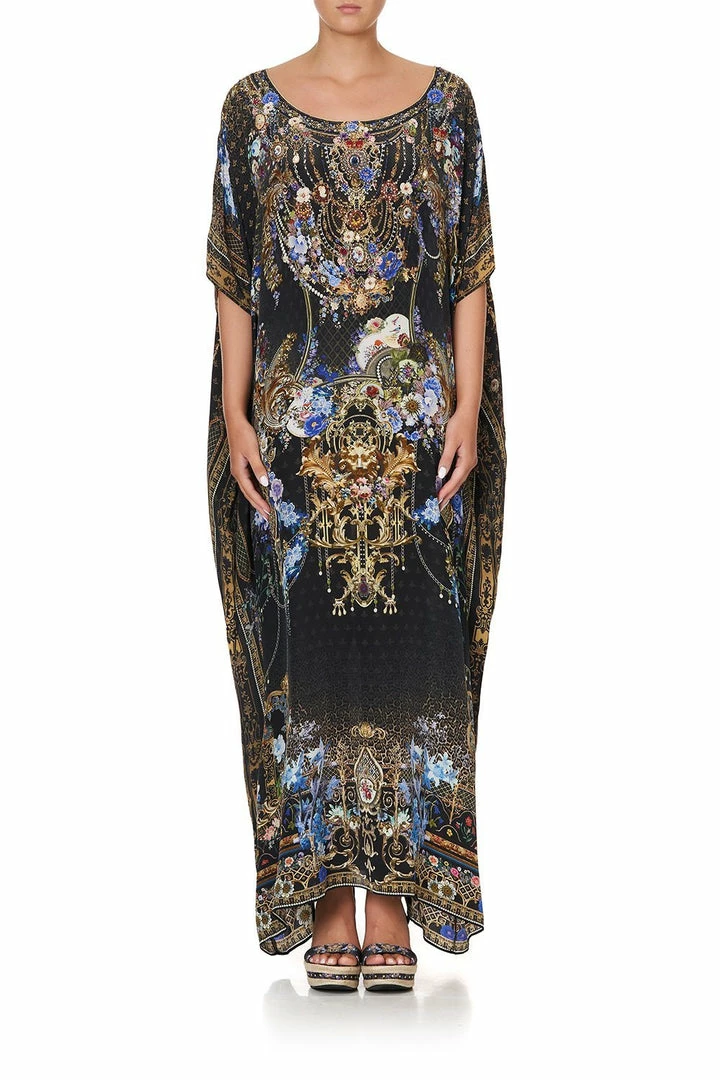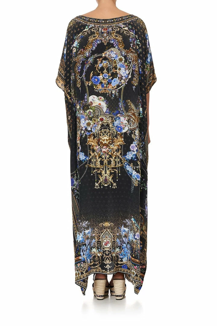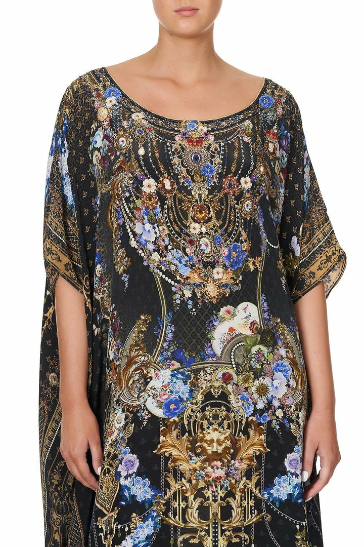 The classic CAMILLA silhouette of the Palace Playhouse Round Neck Kaftan is given an operatic reinvention with a gilded Baroque inspired print. Styled in a long length with round neck and ¾ length sleeves, this relaxed silk kaftan is embellished with hand-placed crystals, scrolling gold foliage and bright heritage blooms. Framed with an ornate contrast border and peppered with contemporary animal print, this luxe resort wear dress can be worn a plethora of ways; tie it short for a glamorous mini dress or wear off one shoulder for a chic evening aesthetic. To discover more ways to style, visit the CAMILLA style guide.