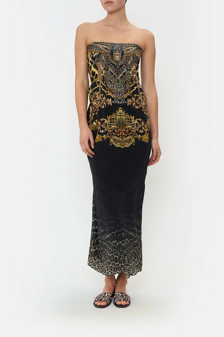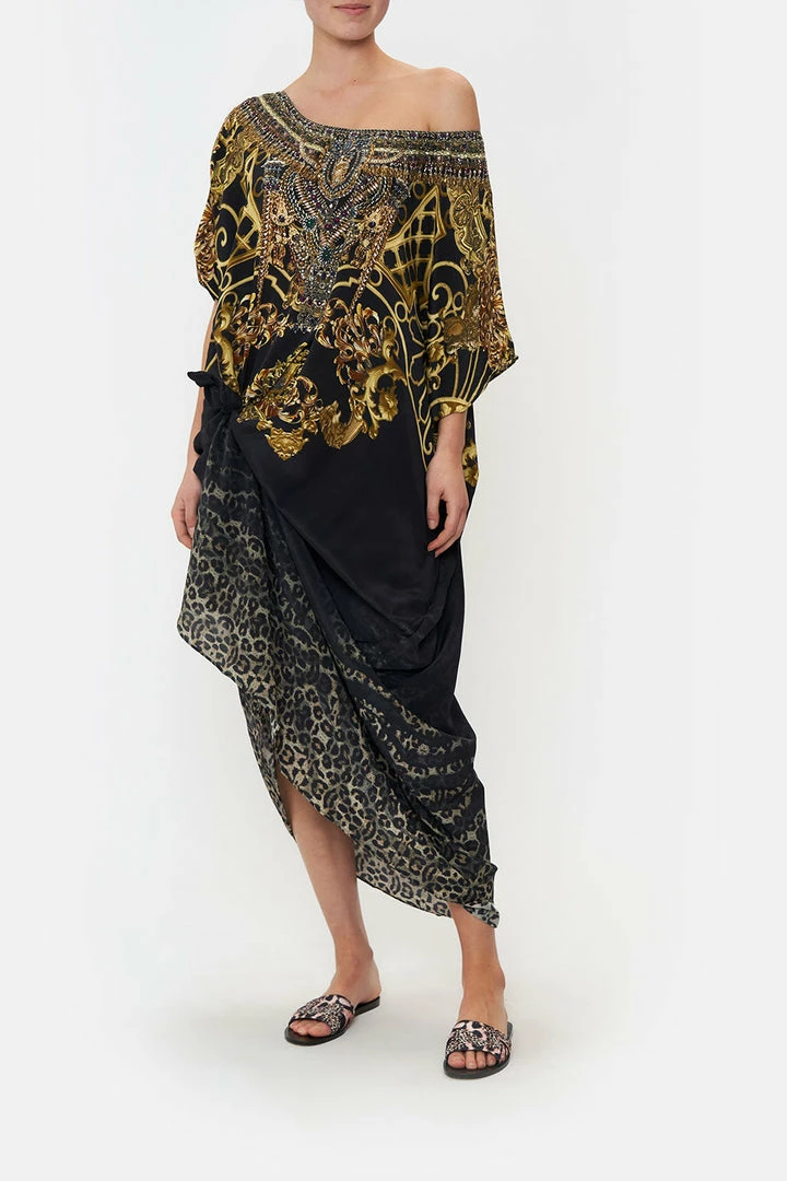 Our signature CAMILLA silhouette meets wild odes, the Shadows Of Armada Round Neck Kaftan is enveloped in a grey leopard gradient before being adorned with lavish gold baroque detailing. Hand-embellished with CAMILLA crystals, this luxury silk kaftan features a generous rounded neckline, cropped sleeves and a relaxed maxi silhouette. With so many ways to wear, transform your kaftan into mini dresses, luxury layers, maxi skirts and shapes of Grecian proportions.