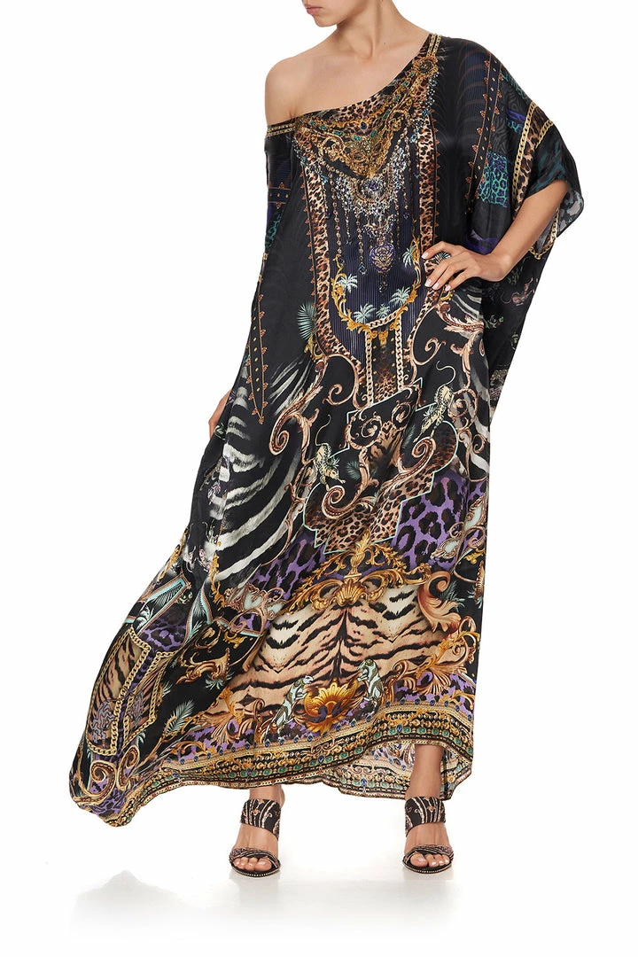 Glimmers of purple and zebra accents entwined within a disco scene scape, the She’s Got Grace Round Neck Kaftan emulates feminine energy of hypnotic women who did exactly what they wanted to, whenever they wanted. The dark tones within this silk are accompanied by accents of purple and zebra, this floor length kaftan has a free flowing silhouette and a round neckline that allows for countless ways of styling. Wear it free flowing, tied short for a mini dress look or tuck up the front for a high low hem style. To discover more ways to style, visit the CAMILLA style guide.