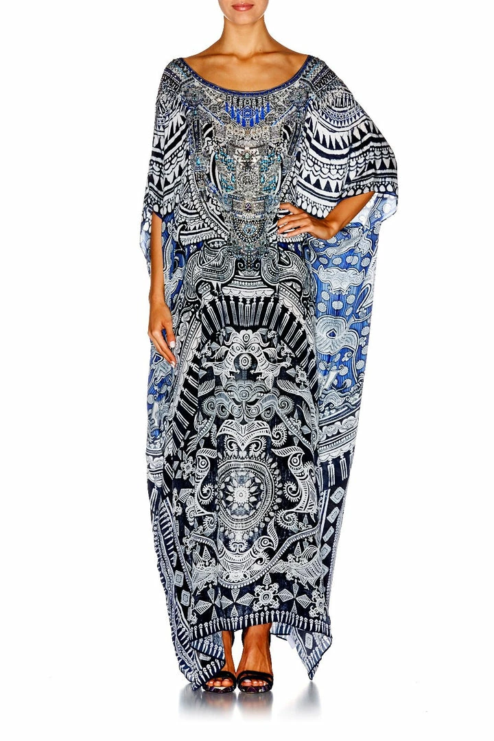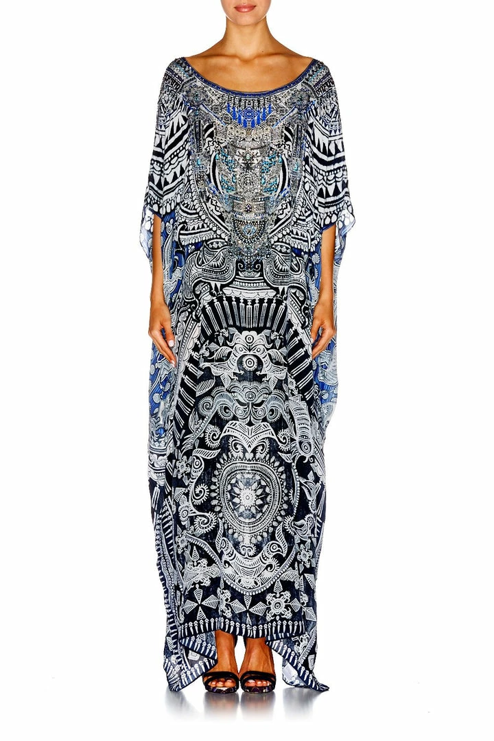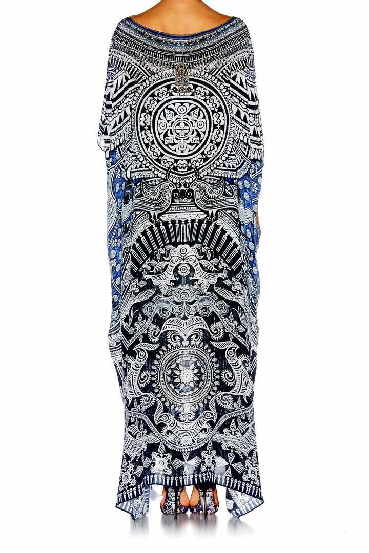 A signature CAMILLA style that will become a mainstay of your bohemian-inspired wardrobe, the Round Neck Kaftan in our exclusive Small Town Hero print is an elegant multi-wear option that is cut from premium silk for maximum softness throughout the silhouette and against the skin. Adorned with hand-applied crystal embellishments to neckline, this staple style is inspired by the unwavering devotion that Batik artists show towards their craft. Take advantage of the multi-wear capabilities of this kaftan and style as a cape or fitted maxi skirt.