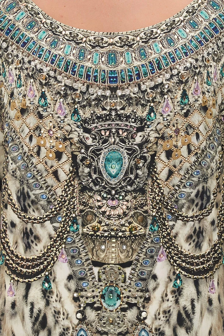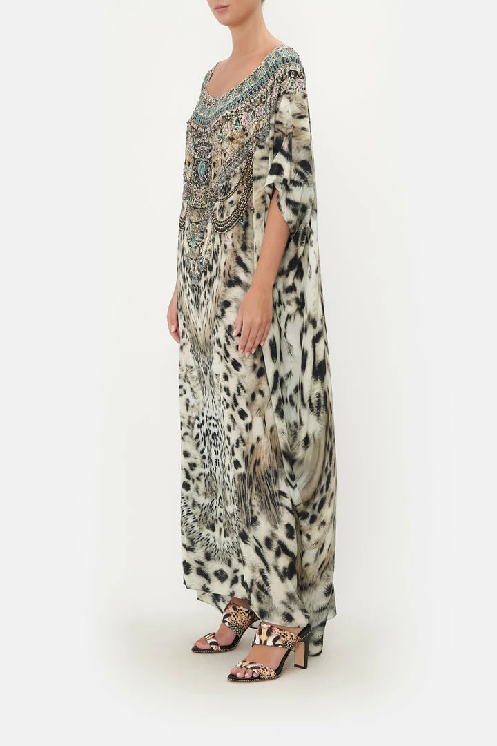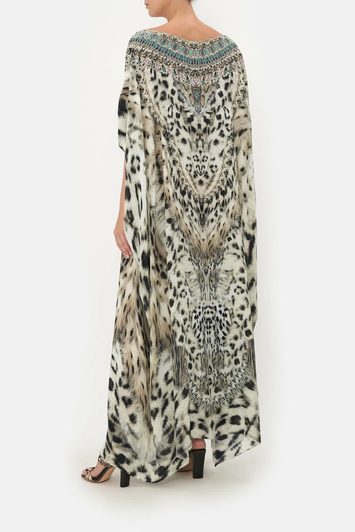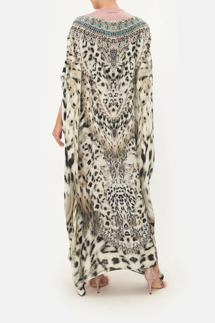 Enveloped in wild majesty, the Snow Whispers Round Neck Kaftan catches all gazes with it’s soft ivory leopard print defined with shades of midnight and swirls of mocha. Hand-embellished with CAMILLA crystals, this luxury silk kaftan features a generous rounded neckline, cropped sleeves and a relaxed maxi silhouette. With so many ways to wear, transform your kaftan into mini dresses, luxury layers, maxi skirts and shapes of Grecian proportions.