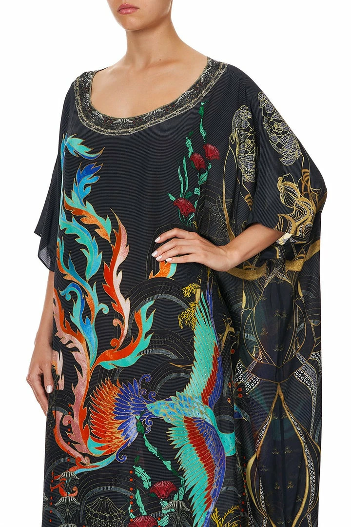 An iconic CAMILLA keepsake maxi dress silhouette, the Wise Wings Round Neck Kaftan is a hypnotic masterpiece that poetically embraces a midnight scene that hosts a dreamscape of vibrant Persian folklore creatures during their night flight. Crafted in a striking black-based hand-painted print with accents of coloured mystical Phoenix, its relaxed free-flowing fit design allows this piece can be styled a myriad of ways time and time again. Wear free flowing, tie to a mini-dress for a night of dancing, or style off the shoulder for a chic evening affair. To discover more ways to style, visit the CAMILLA style guide.