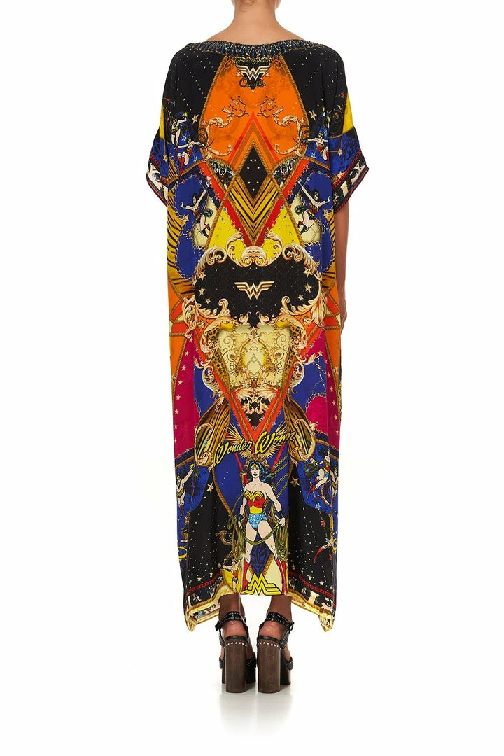 This season, CAMILLA celebrates sisterhood and female leadership – the theme of this year’s International Women’s Day – with a sartorial tribute to beloved trailblazer Wonder Woman and her vision of truth, justice and equality. Adorned with a powerful montage depicting her warrior strength, the Wonder Woman Round Neck Kaftan tells the story of this compassionate leader in a billowing of pure CAMILLA silk. Vibrant comic book hues are accented with signature pops of animal print and gold highlights whilst a dazzling crystal embellished neckline frames this epic canvas. Designed in a relaxed fit, this silk kaftan dress is finished with 3/4 length sleeves and a round neckline. Style with statement shoes and a hunger for change in your personal journey to parity.