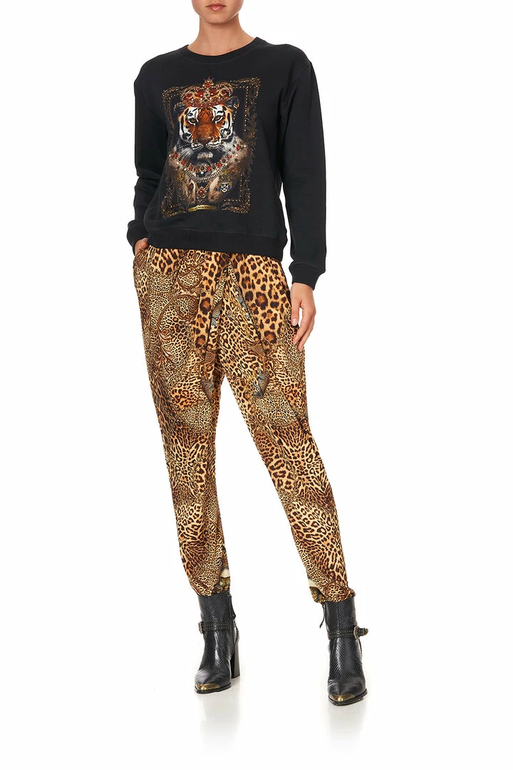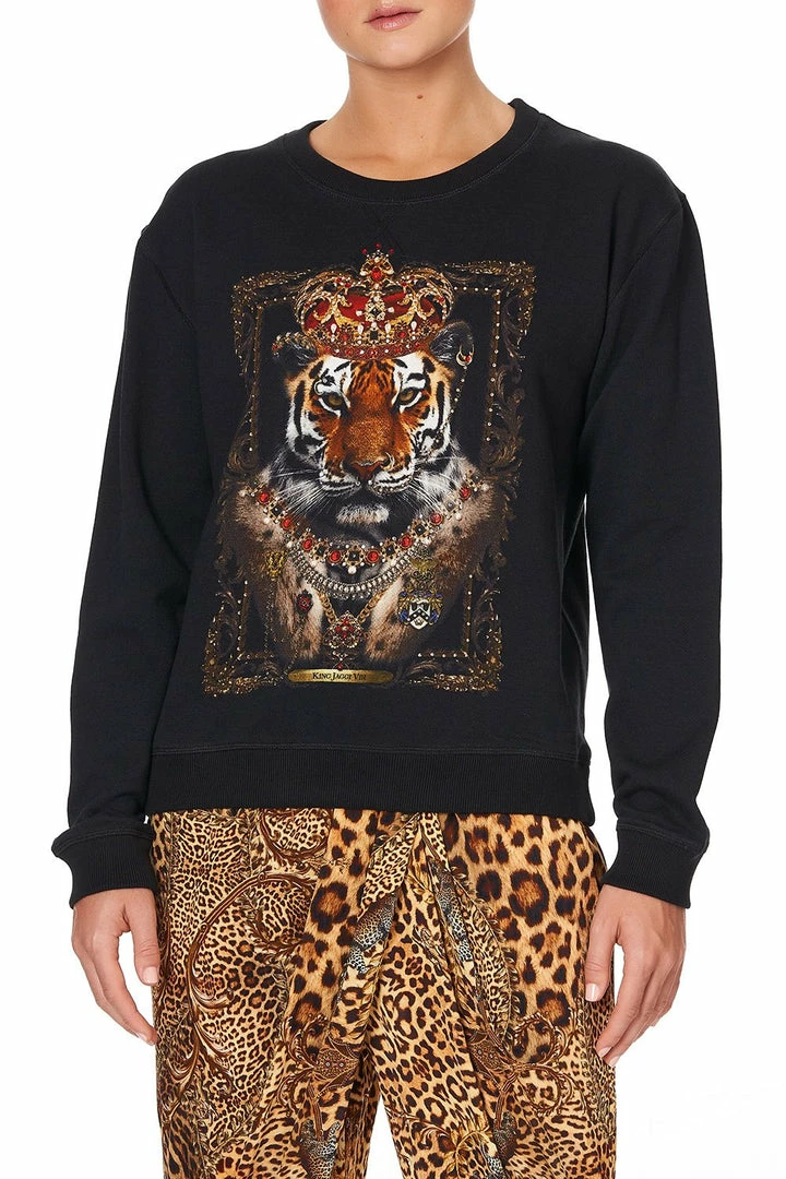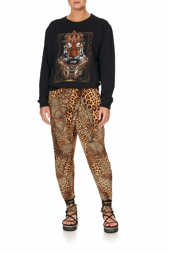 A loungewear layer with a regal ambiance, the Lady Lodge Round Neck Sweater is a statement jumper with a hint of signature CAMILLA whimsy. The portrait of a bejewelled monarch, with an insatiable appetite for wild adventures, adorns the front of this relaxed fit sweater, framed by long sleeves, a round neck and ribbed hem and cuffs. A playful take on a winter essential, CAMILLA crystal embellishment adds a touch of sparkle to this casual printed jumper. Pair with the matching Lady Lodge Jersey and Silk Mix Drop Crotch Pant for head-to-toe loungewear luxe.