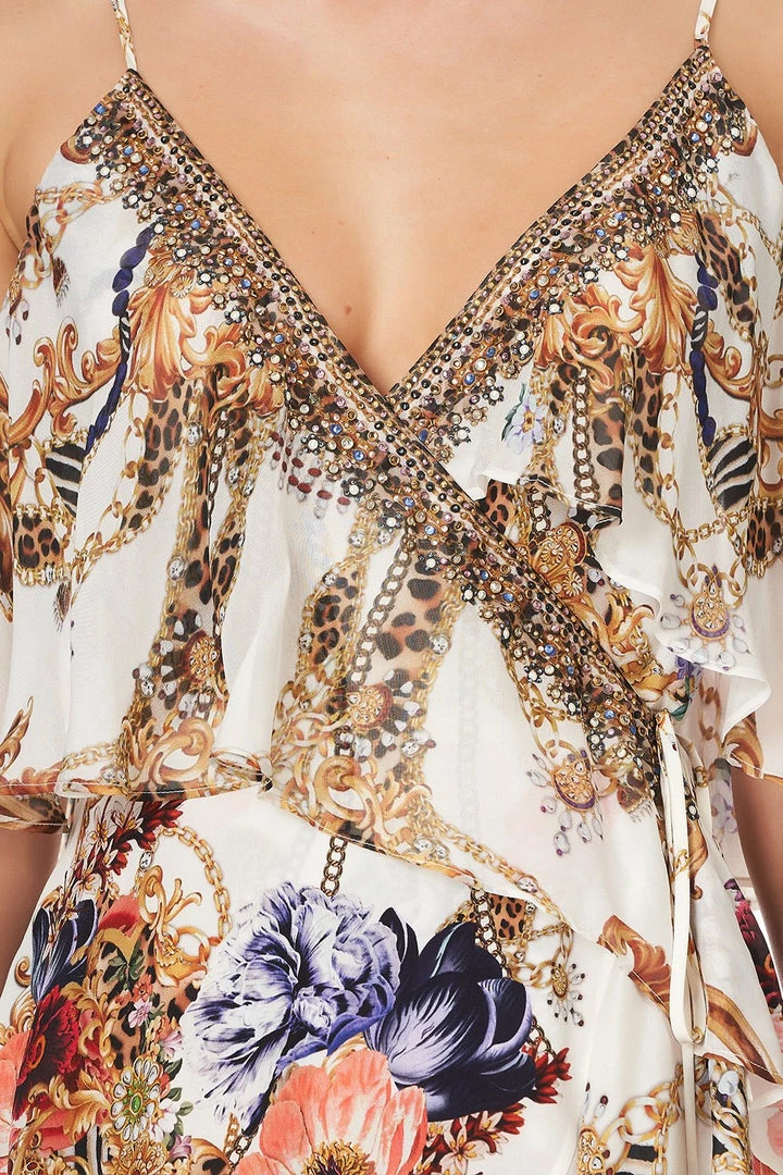 Lean into romantic frills and delicate billows this party season with the Reign Supreme Ruffle Overlayer Wrap Dress. An ode to the naughty nineties, explore the world of excess and extravagance. Ivory silk meets ornate golden details, purple-toned botanicals and signature CAMILLA crystals. This occasion dress plays host to delicate ruffle sleeves that dance at the elbow, a wrap-style design to cinch the waist and a high-low hemline defined by frill. Pair back with the matching Espadrille With Tie.