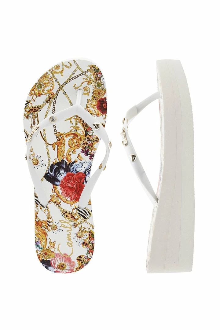 Explore new heights in casual wear with our Reign Supreme Platform Thong. An ode to the extravagance that defined the tantalising nineties, inspiration called from decades gone by. A contrast gold toe strap greets a sole steeped in ivory hues, purple florals and chain detailing. This summer essential features an elevated heel, a gold CAMILLA logo and luxe metal hardware to add the finishing touch.
