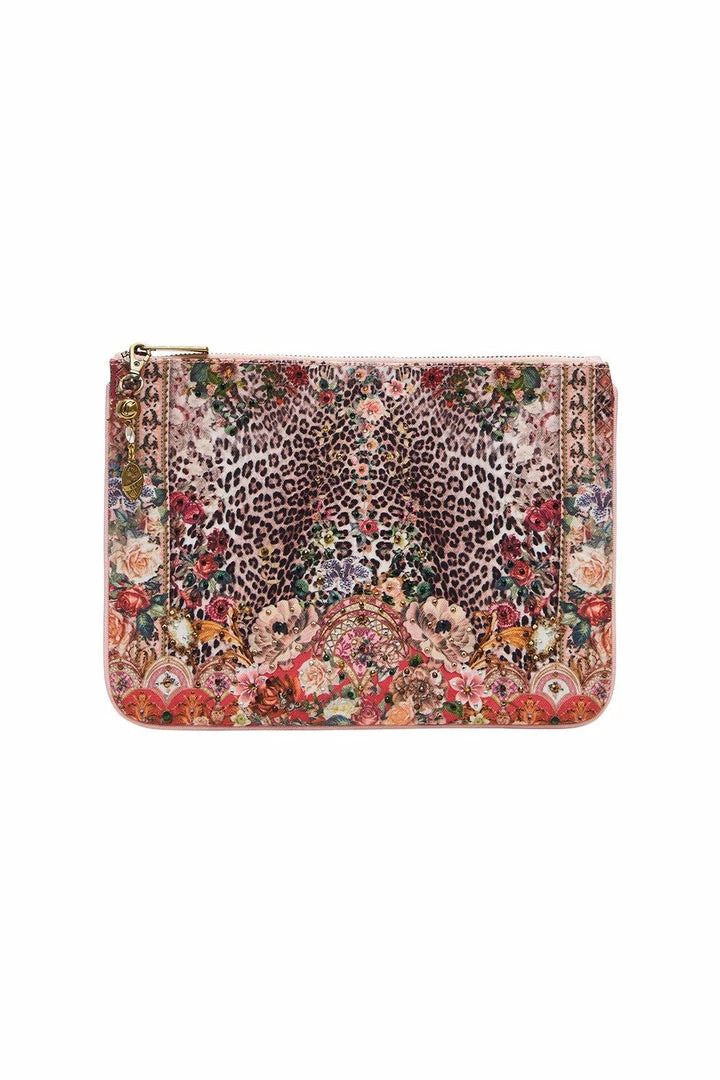 Invite a layer of pink between the fingertips with the Anarchy At Annabels Small Canvas Clutch. Inspired by the plush pink powder rooms that envelope the renowned London high society club Annabel’s, flora and fauna collide in a masterpiece of Mother Earth’s creations. Hand-illustrated by our in-house artisans, the flowers bloom in shades of peaches of cream before blending into a sea of blush leopard print. This luxury purse features signature CAMILLA crystals, contrast pink trim, interior pockets to keep you organised and a golden tassel that cascades from the zip closure.