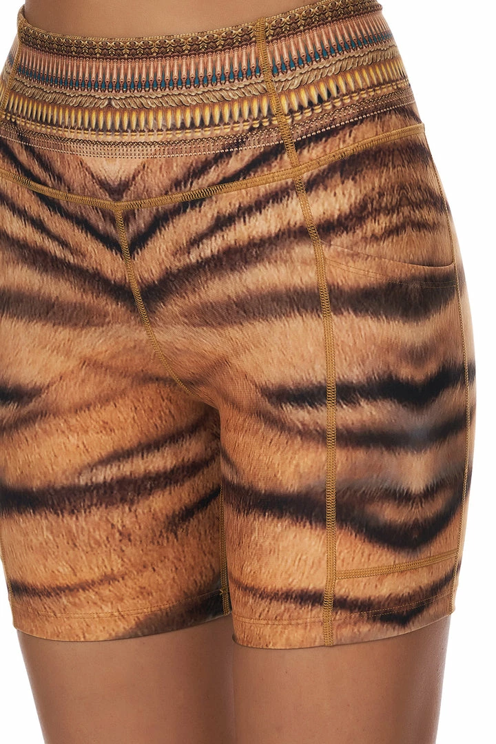 Cropped for maximum sculpt, the Feline Fine Running Short With Pocket explores all that is untamed and wild. Inspired by the rich prints that enwrap prowling tigresses, we are met with wind-swept stripes. Soft golden notes layer upon deep earthy browns to warm and flatter the skin before blue and bronze crystals scintillate at the waist. These luxury running shorts feature shrink resistance technology, anti-pilling fabrication, concealed pockets and a high-rise cut. Style with the Banded Racer Back Crop.