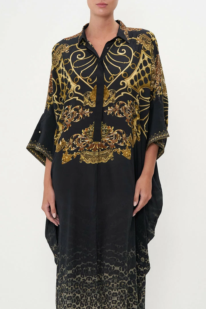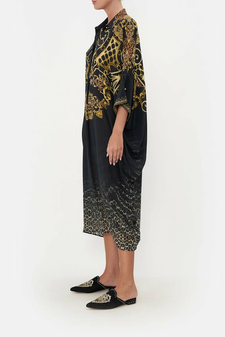 Decadently ornate, the Shadows Of Armada Batwing Tunic Dress is immersed in a grey leopard gradient before being adorned with lavish gold baroque detailing. Complete with hand-embellished crystals, this luxury silk dress features a wide batwing sleeve that crops below the elbow, a structured collar, a relaxed midi silhouette and pocket functionality.