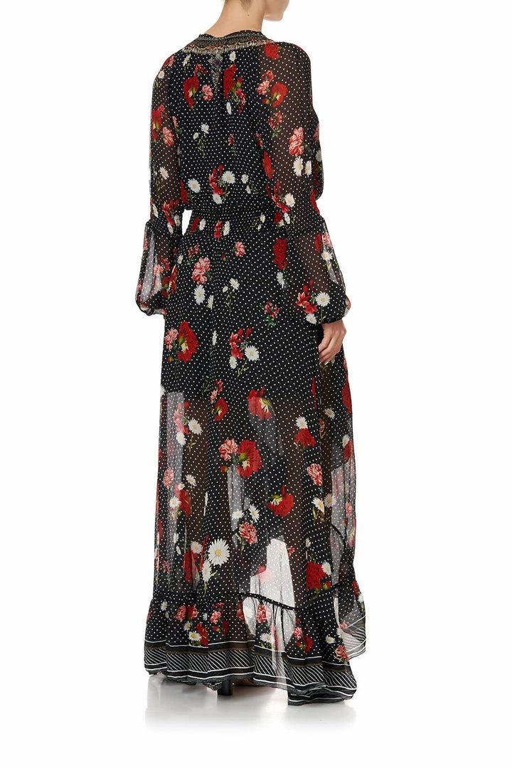 A statement boho maxi dress, the Coastal Parisienne Blouson Sleeve Wrap Dress in loving tribute to Brigitte ‘s dripping charisma that will always leave you wanting more. This incredible silk maxi dress features a flattering shirred waistband and sleeves, wrap front with button closure, lavish contrast ruffles to the hem as well as hand-placed scattered crystal embellishments for a complete glittering mermaid finish.