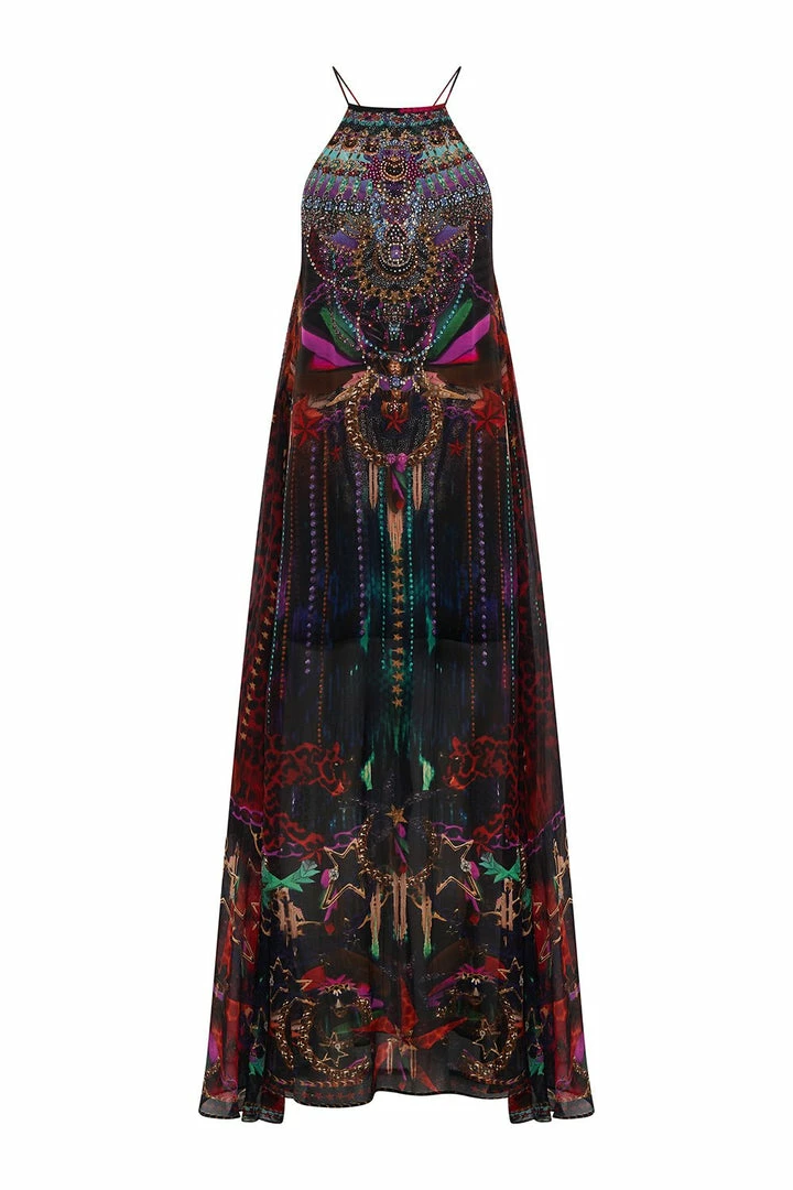 Slip into a sheer layer reminiscent of the finest wine in our Rocket Woman Halter Overlay Dress. Luscious silk is reimagined in an ode to the glam rock goddesses who made the eighties their own. Rich mahogany is enwrapped by vivid pops of teal, fuchsia and raspberry. Adorned in tantalising crystal, this luxury occasion dress sports a halter style neckline, a relaxed maxi silhouette and a softly draped hemline that dances at the ankle.