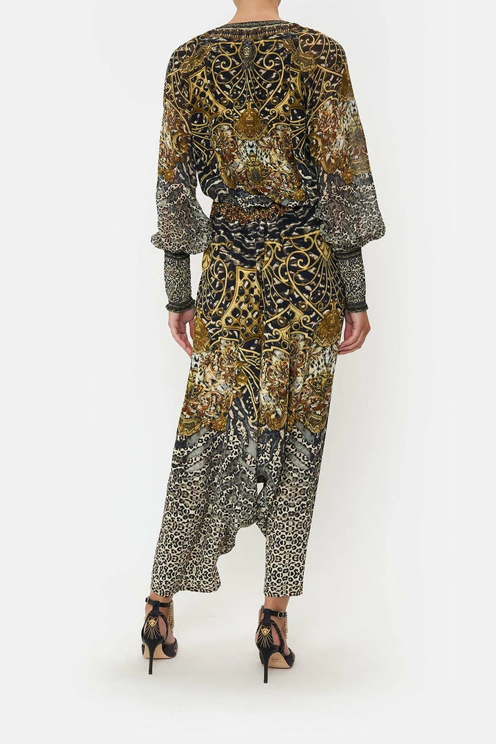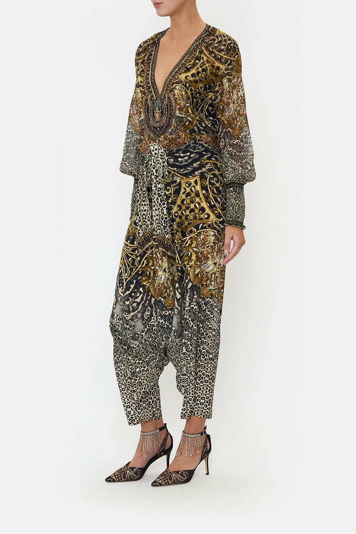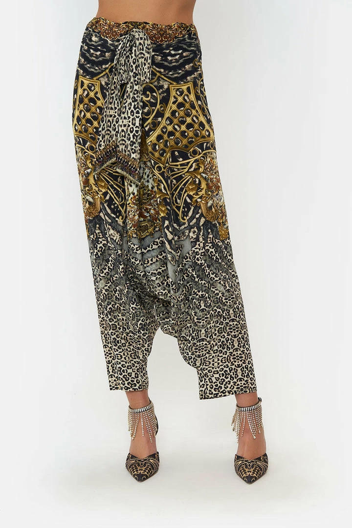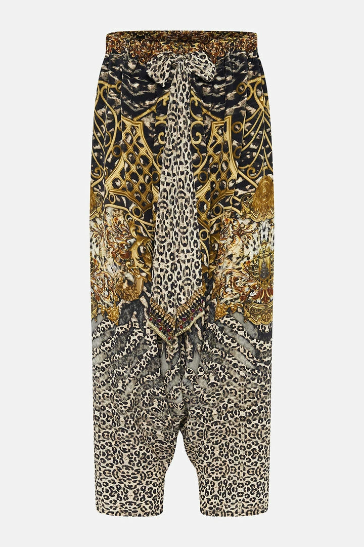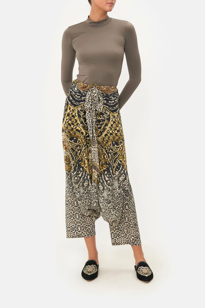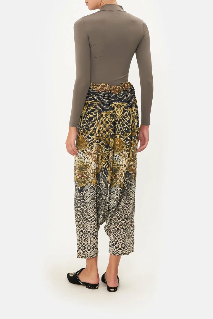 Gold cascades meeting wild inspirations, the Armada Harem Pants are enveloped in swirls of leopard print defined by lavish gold baroque detailing and ornate architecture. Complete with hand-embellished CAMILLA crystals, these silk harem pants play host to a drop crotch style, drawstring ties that cinch and shape the waist, a relaxed silhouette and a full length pant that dances at the ankle.