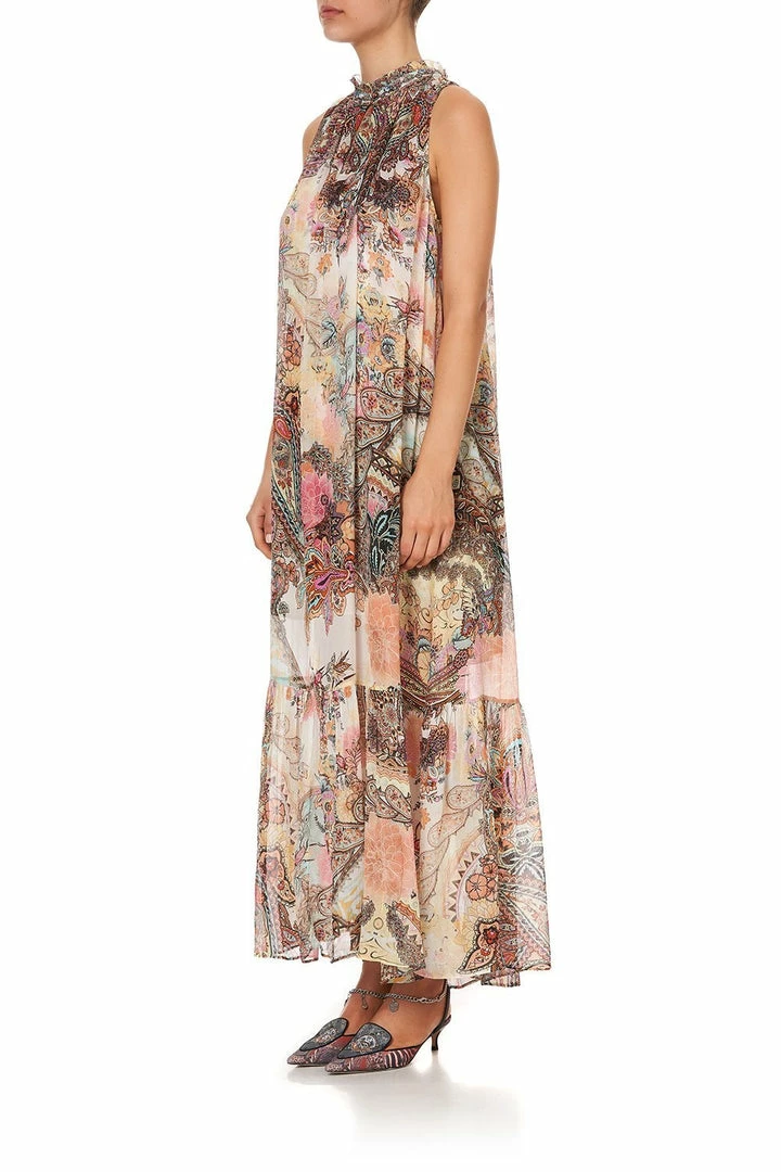 Revive retro party style in the Carnaby Disco High Neck Keyhole Dress. Its paisley and floral print is inspired by London in the sixties, sporting pastel shades digitally printed onto silk and finished with CAMILLA crystals. Its gathered neck features a keyhole split and a maxi length and frilled hem gives it a statement silhouette. Wear with flat as an elegant summer dress or throw on some heels for some swinging sixties fun.