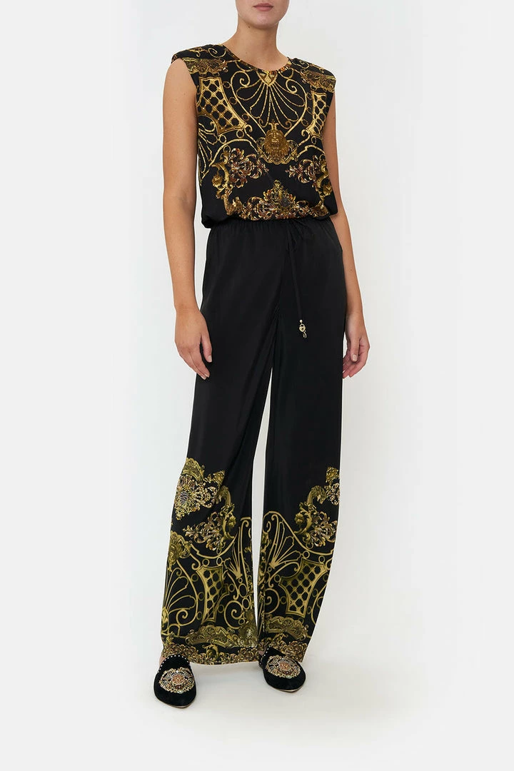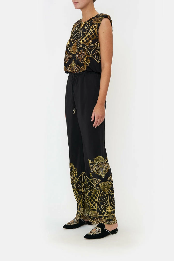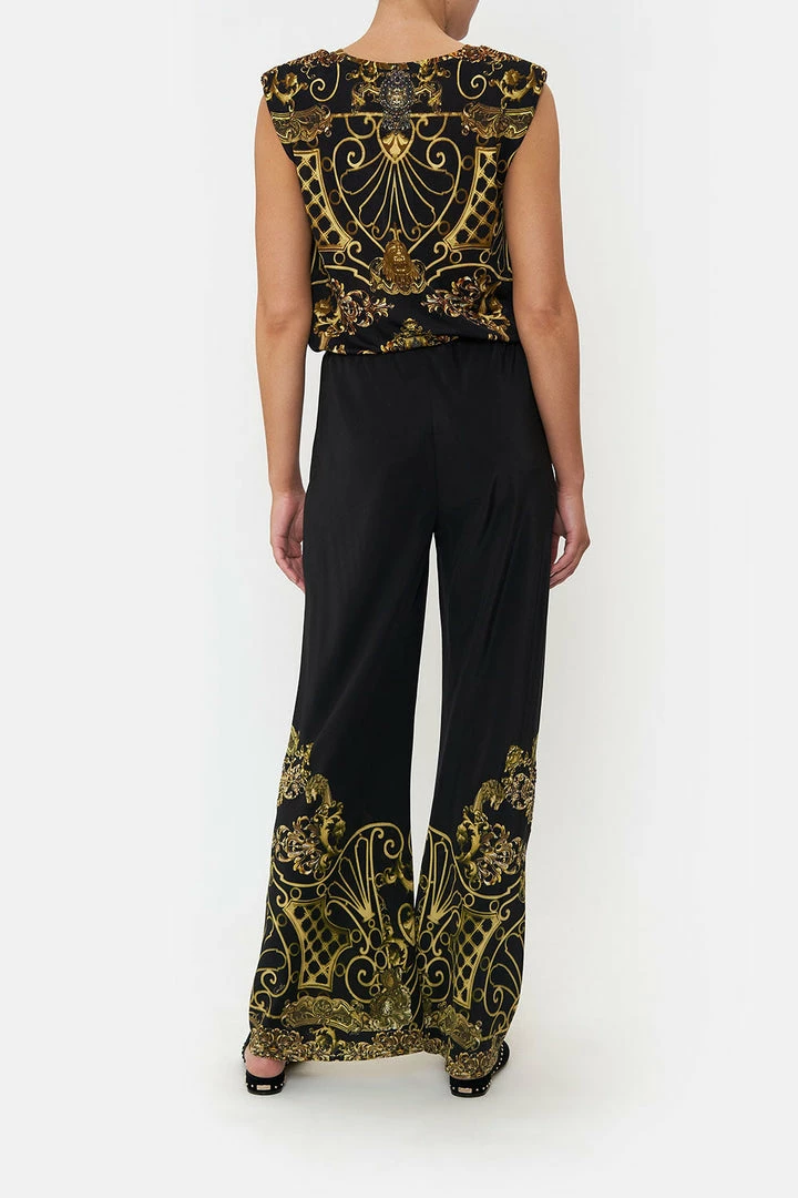 Summer wear meets royal details, the Shadows Of Armada Jersey Muscle Tank captures the gaze with classic midnight shades adorned with gold baroque detailing, striking big cat portraits and swirls of opulent architecture. Complete with hand-embellished CAMILLA crystals, this luxury muscle tank features a relaxed sleeveless silhouette, a crew neckline and an easy slip-on style.