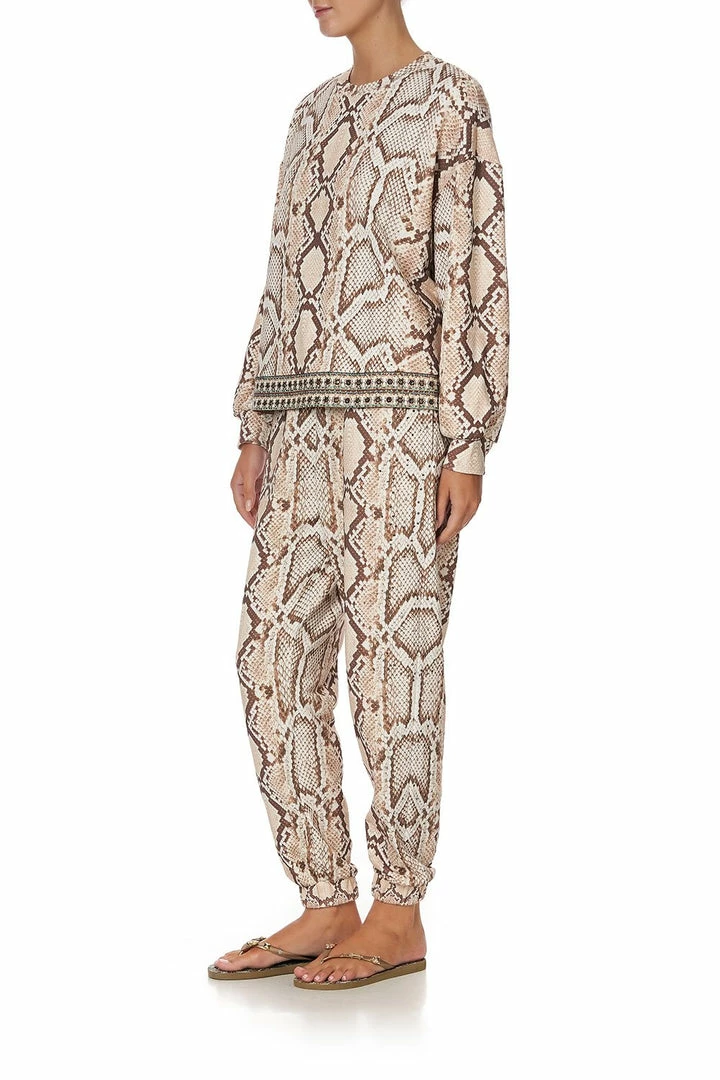 Luxe loungewear is revived with wild inspiration in the Gaze Of Medusa Jersey Track Pant. In a homage to the reigning majesties that roam our lush Mother Earth, pure cotton is reimagined. A classic snake print is adorned in earthy neutral tones and cedar-brown hues. This luxury track pant sports an elasticated drawstring waist, a relaxed leg that leads into a cinched cuff and a full-length silhouette. Style with the matching Short Relaxed Sweater.