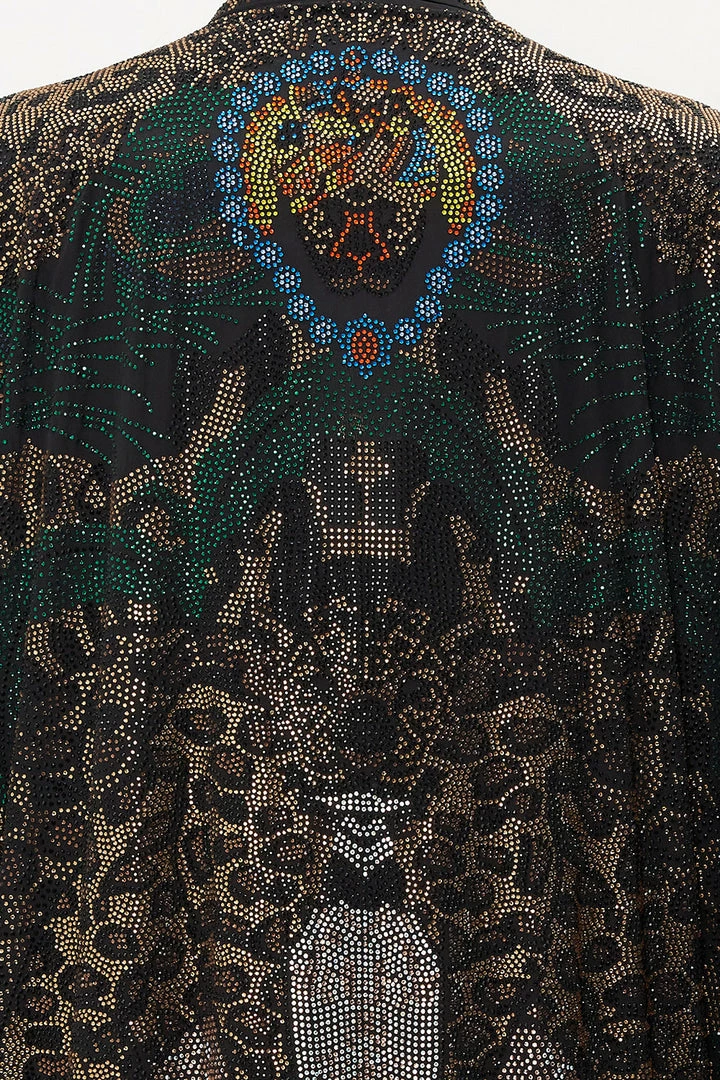 Rich in the fruits of Mother Earth, the Surrealist Xanadu Kimono Coat captures our imagination with deepened sunset hues, untamed big cat majesty and intricate all-over crystal embellishment placed by hand. This luxury silk kimono coat features a relaxed maxi silhouette, a statement wide sleeve and a contrasting neckband that defines the décolletage.