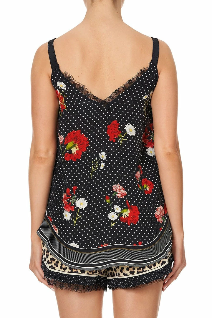 A charming singlet style top enchanted with the tales of Brigitte, the Coastal Parisienne Lace Up Eyelet Cami is a vision of silk opulence. Exploring women who are dripping with charisma that will always leave you wanting more, this floaty black silk cami is formed with an alluring v neckline, flared body for flattering shape, lace trim and is finished with hand-applied CAMILLA crystals. Pair back with black leather pants and sky rise heels for the perfect flirty look.