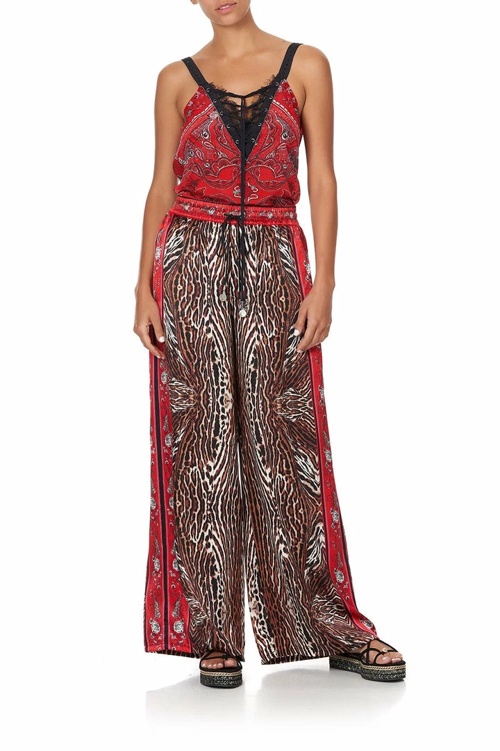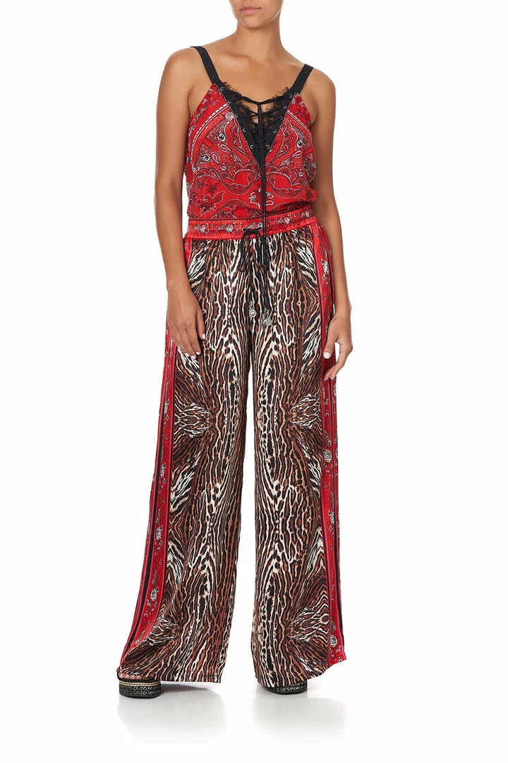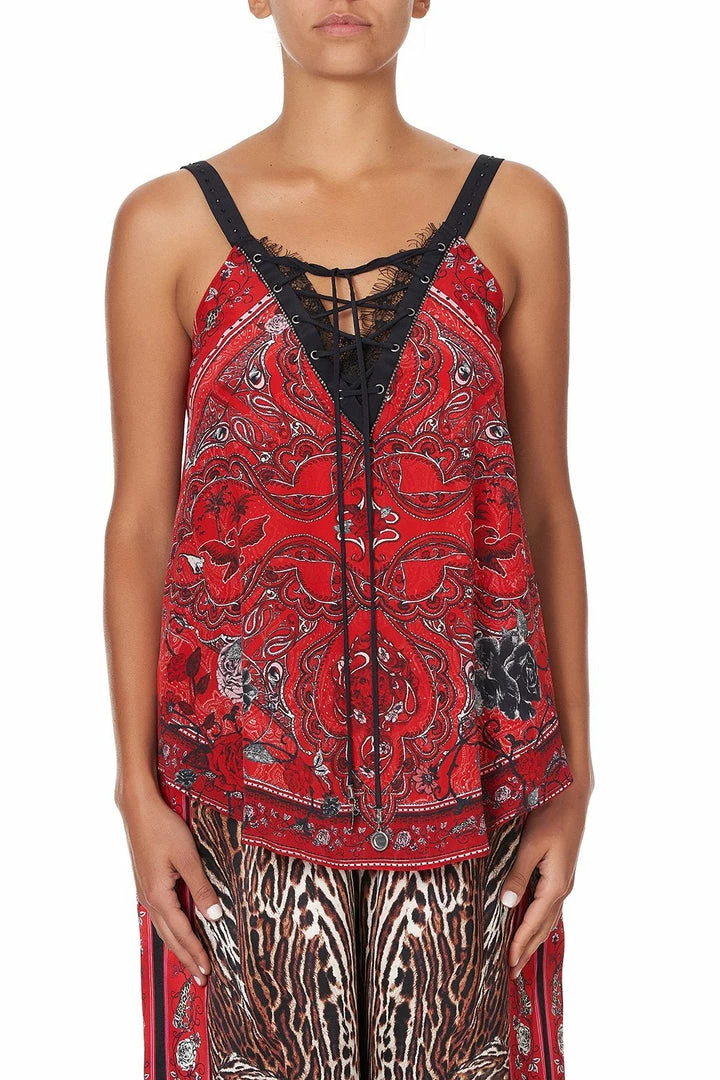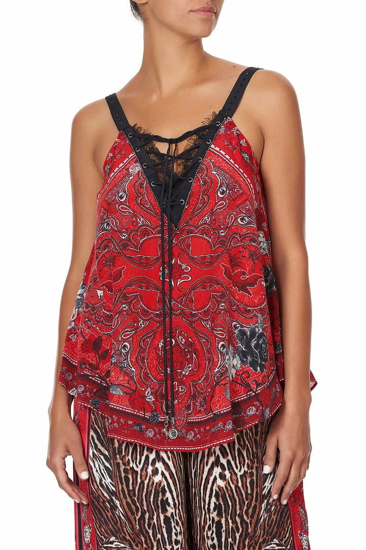 Admiring its charming paisley print and lace trim, you would never imagine that musings of mutiny would have inspired the Pirate Punk Lace Up Eyelet Cami. Crafted in the softest silk, the V Neckline and flared body flirt with the idea of feminine charm whilst the eyelet lace up neck and pirate inspired charms remind you that adventure lies ahead. CAMILLA crystals finish a look that is perfectly paired with black leather pants, sky high heels and a knowing smile.