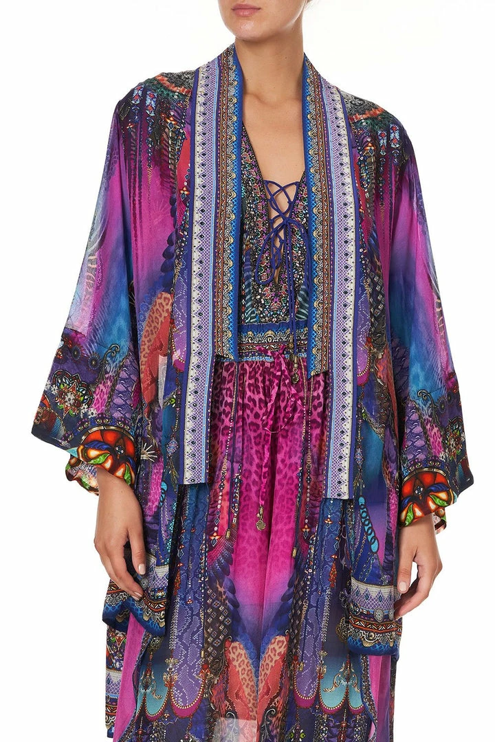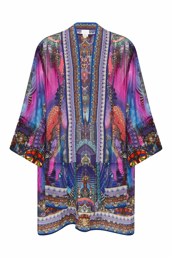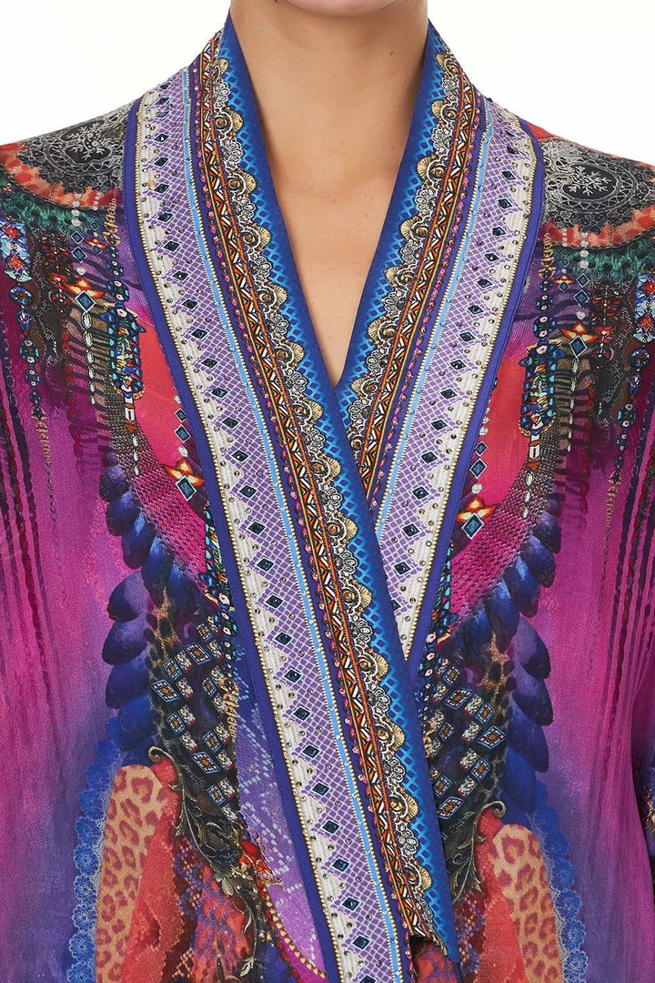 Strike a perfect harmony of colourful fun and modern sensuality with the Midnight Madness Layering with Neck Bands. This versatile layering piece is an infusion of visual interest. Crafted from pure silk that flows like water, wrap yourself in this vibrant canvas trimmed with architectural shapes, inspired by the domed ceilings of ancient cathedrals. This purple silk layer features dramatic wide sleeves with dropped shoulders for unencumbered comfort. The side splits and sprinkled CAMILLA crystal details provide a sense of bohemian grandeur to this silk robe. Layer over the Midnight Madness Curved Hem Pants for relaxed luxe tailoring.