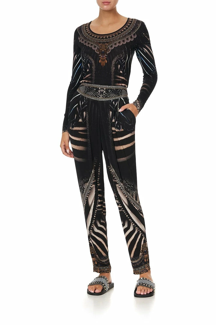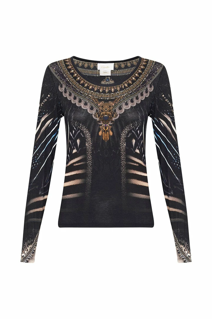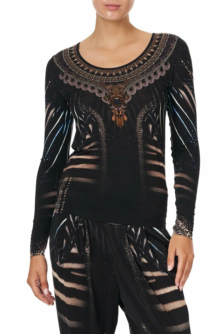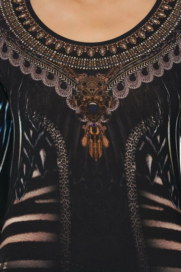 Sleek and scintillating, the Quechua King Long Sleeve Fitted Top hugs the skin with art inspired by the dawn of time. An elevation of casual wear, this statement top plays host to bronzed tiger stripes and subtle panels of jaguar print. The pièce de résistance lies in the rounded neckline, boasting elaborate crystal embellishments that lead into a rich patterns and golden amulets.