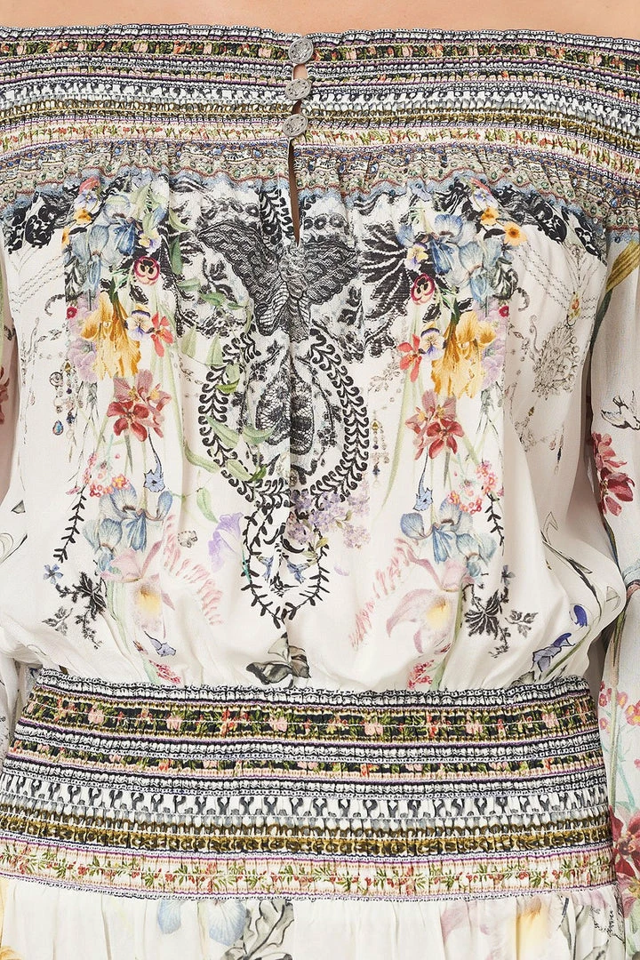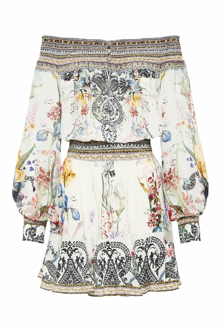 A flirtatious silk mini dress adorned with soft garden florals, the True Romance Off Shoulder Short Dress is a charming summer style crafted with gracious blouson sleeves. A frilled hemline and off-shoulder neckline add to the playful tone of this mini dress whilst a shirred neckline, waistband and cuffs give a sophisticated sense of structure. Finished with hand-placed CAMILLA crystals, this floral summer dress is best styled with wedges to accentuate the romance of this style.