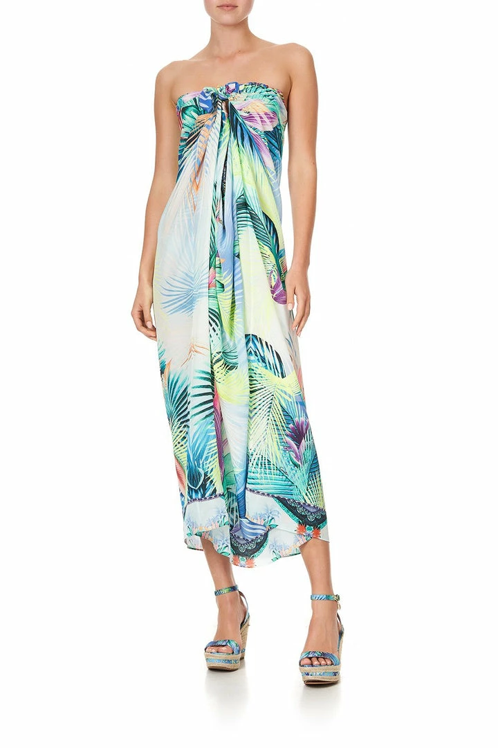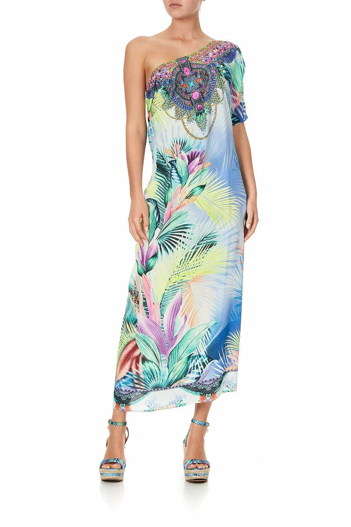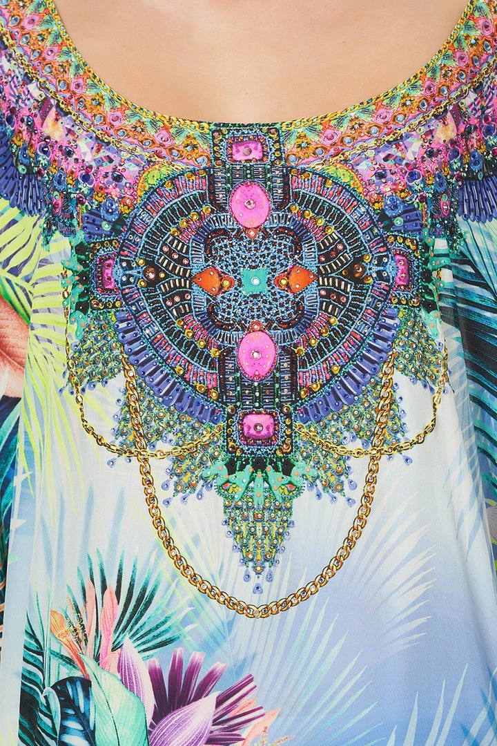 Classic CAMILLA resort-wear is reimagined in icy hues with the Whats Your Vice Round Neck Kaftan. Crafted from lavish silk, inspiration calls from the vibrant sunset paradises that captivated eighties California. Soft-spoken blue tones take centre stage as emerald botanicals and neon ferns are adorned throughout. This luxury silk kaftan features a generous round neckline, a relaxed maxi silhouette, cropped sleeves and a multi-wear design. With a plethora of ways to wear, transform your kaftan into mini dresses, maxi skirts, summer layers and cuts of Grecian proportions.
