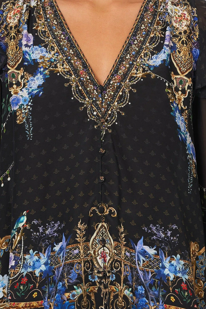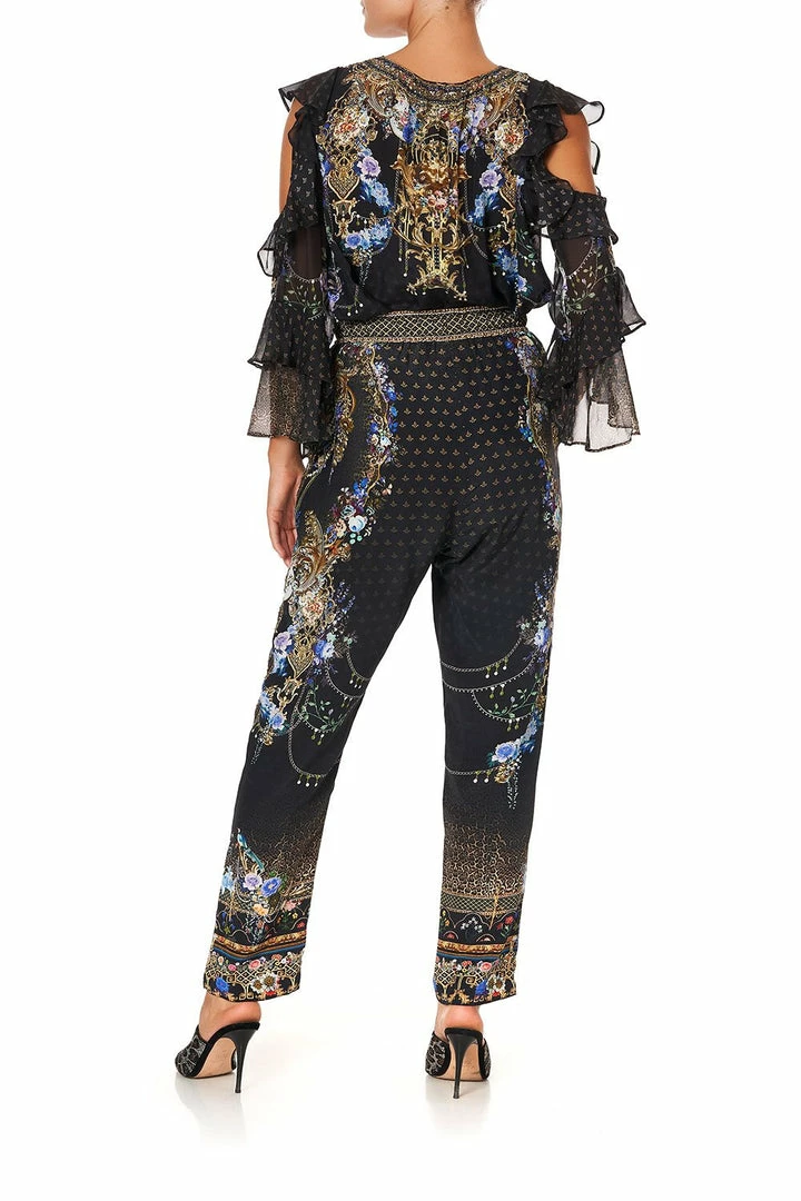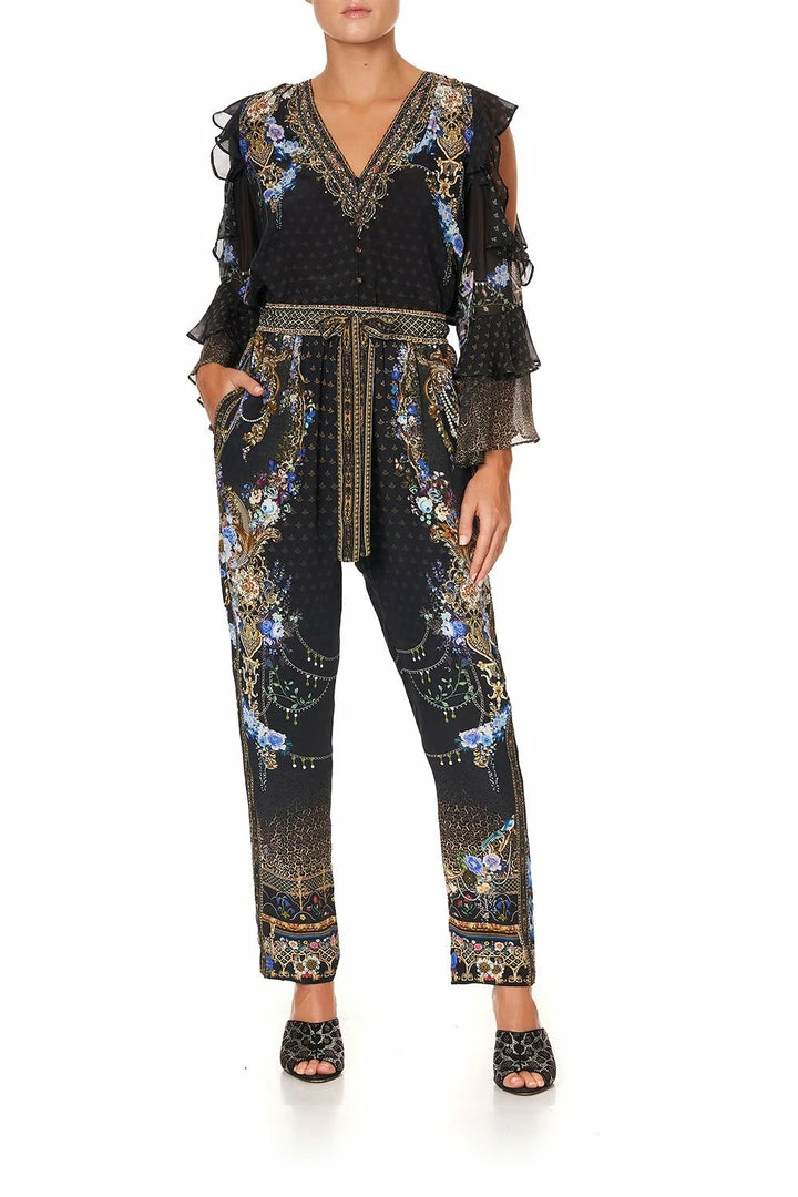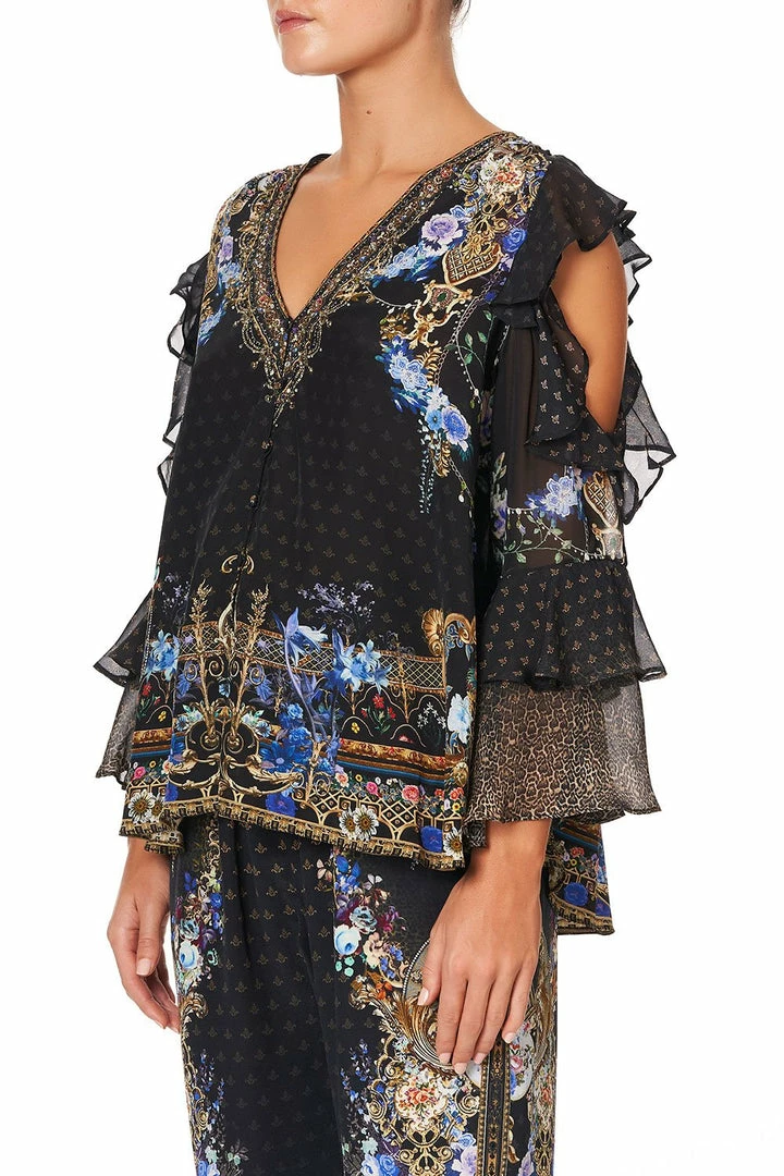 A flamboyant superabundance of Baroque motifs decorates the Palace Playhouse Ruffle Cold Shoulder Blouse. Inspired by the grandeur of a stately residence, this black CAMILLA silk shirt is accented with gilded architectural details intermingled with bright botanicals and subtle animal highlights. Cut in a relaxed fit, this silk top is finished with a button front close, V neck and flared cold shoulder sleeves, adorned with decadent flared layers. Style back with the Palace Playhouse Drop Crotch Slim Leg Pant for exuberant drama.