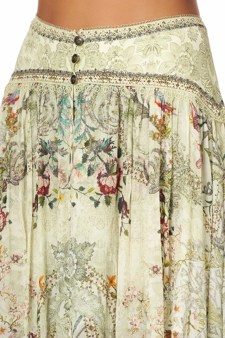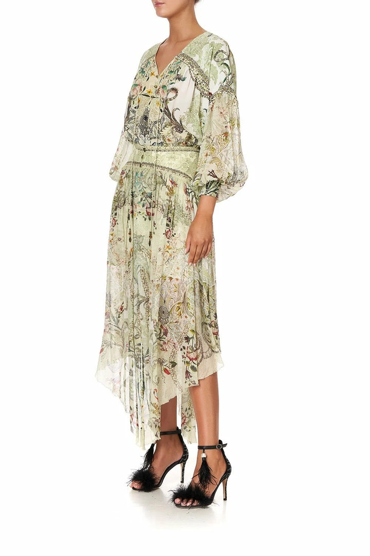 A defining skirt of romantic proportions, the Brick Lane Beauty Shaped Waist Skirt is exclusive to our CAMILLA x The Victoria and Albert Capsule Collection. In an ode to 18th-century floral works of Anna Maria Garthwaite, we see a plethora of tonal green hues encapsulate the silhouette. This statement skirt plays host to a curved yoke high waist cut, button detailing down the centre front, shirring across the back and a multi-length hem for added dimension. Complete the silhouette with the Blouson Blouse With Neck Tie.
