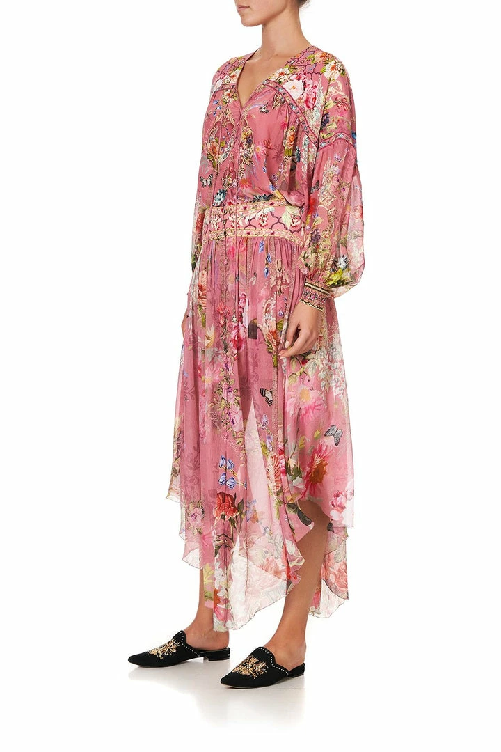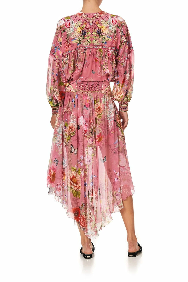 Float in florals with the Patchwork Heart Shaped Waist Skirt. This draped, flowing skirt is defined by a heart shape that brings the hem higher at either side, teamed with a shirred elastic waist to create a feminine silhouette. Adorned in soft pink florals inspired by English gardens and antique markets, its as fit for ocean walks as it is for a special occasion.