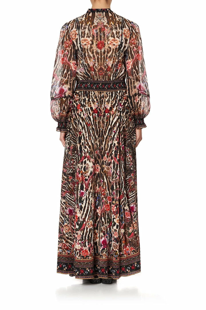 A floor length maxi dress enriched with scenes of wild floral accents, the Liv A Little Shirred Waist Dress With Split oozes with the inner goddess within you. Crafted in a heavenly floaty leopard silk showcasing a print of sweet seduction amongst fiercely feminine blooms, this printed maxi dress boasts charming lace trim, delicate hardware detail, digitally printed buttery silk and finished off with hand-placed CAMILLA crystal embellishments across the neckline as detail.