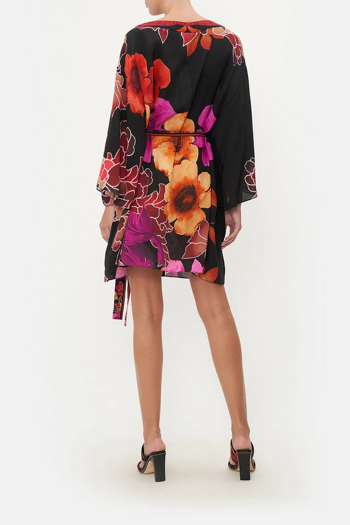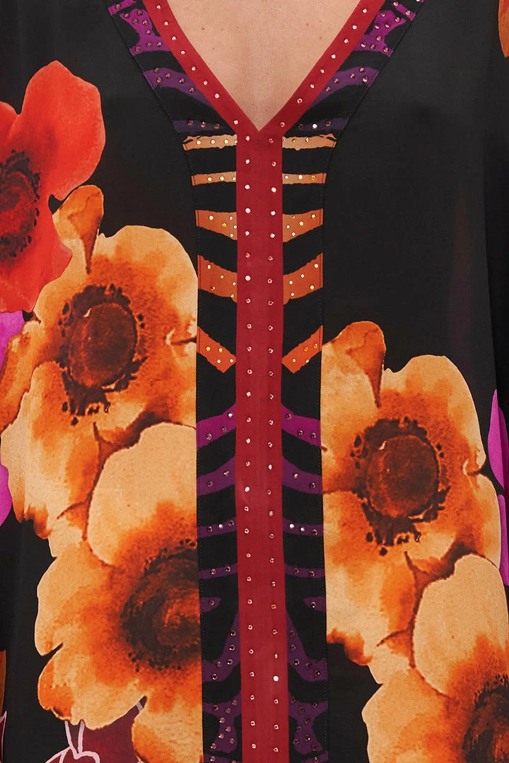 Enwrapped in floral cascades, the Midnight Poppy Short Kaftan With Neckband calls to a sea of midnight hues defined by poppies blooming in shades of crimson, burgundy and magenta. Sporting hand-embellished crystals, this luxury silk kaftan plays host to a classic v neckline with necktie details, a billowy wide statement sleeve, a waist-tie detail and a cropped relaxed silhouette.