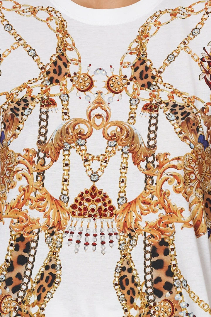 Rethink the wardrobe classics with the opulent Reign Supreme Slim Fit Round Neck T-Shirt. Imagined with the extravagance and excess of the tantalising nineties in mind, we take a step back in time for inspiration. Crisp white cotton sets the scene for ornate gold chain detailing, pops of leopard print and pearlescent chandeliers. This elevated essential features a cropped sleeve, signature CAMILLA crystals and semi-fitted silhouette.