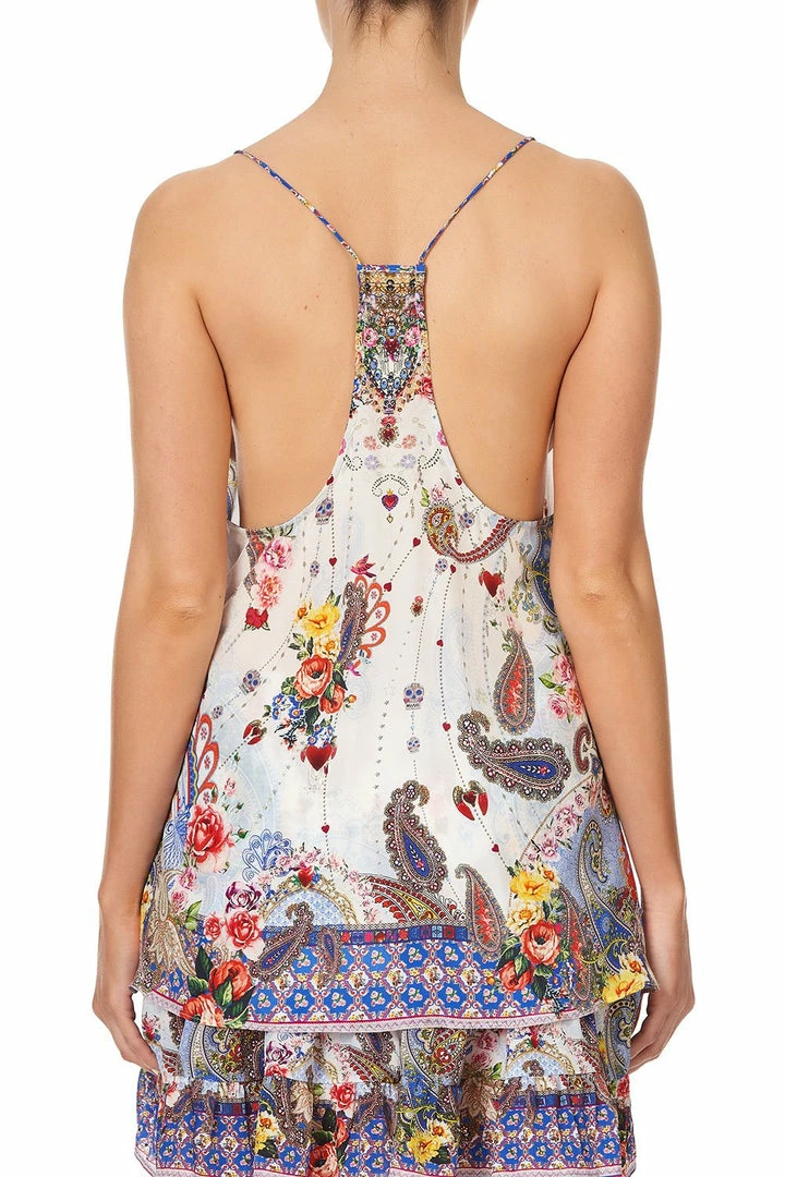 Mused by Frida’s love of Mexico, the Frida Freedom T Back Shoestring Top is a kaleidoscope of artful colour and Mexican motifs highlighting her passion for Mexico and its deep rooted culture. This piece features a round neckline, shoestring straps, a flattering flared hemline and hand placed CAMILLA crystal embellishments. Pair with the Frida Freedom Short Shirred Skirt for an effortlessly gorgeous summer outfit.