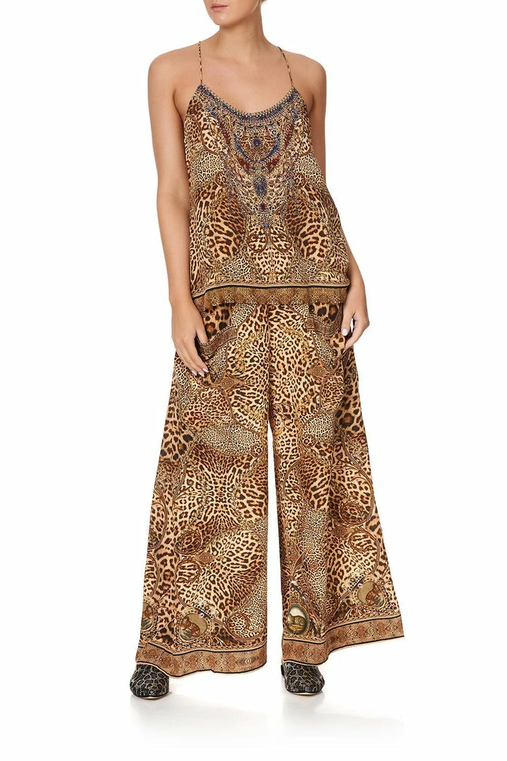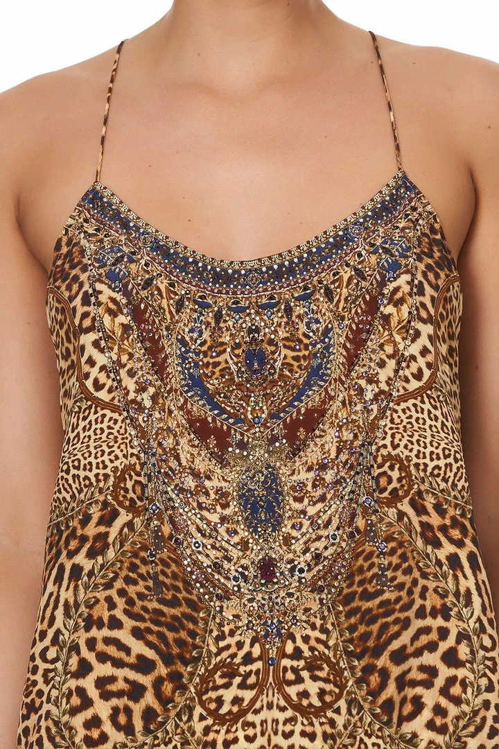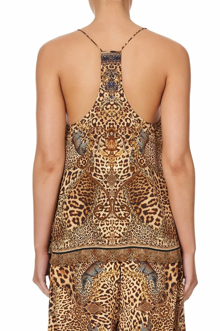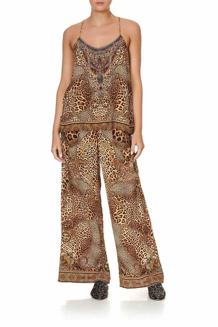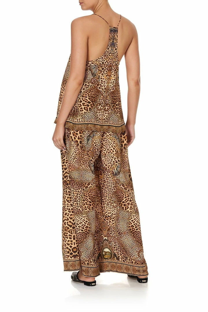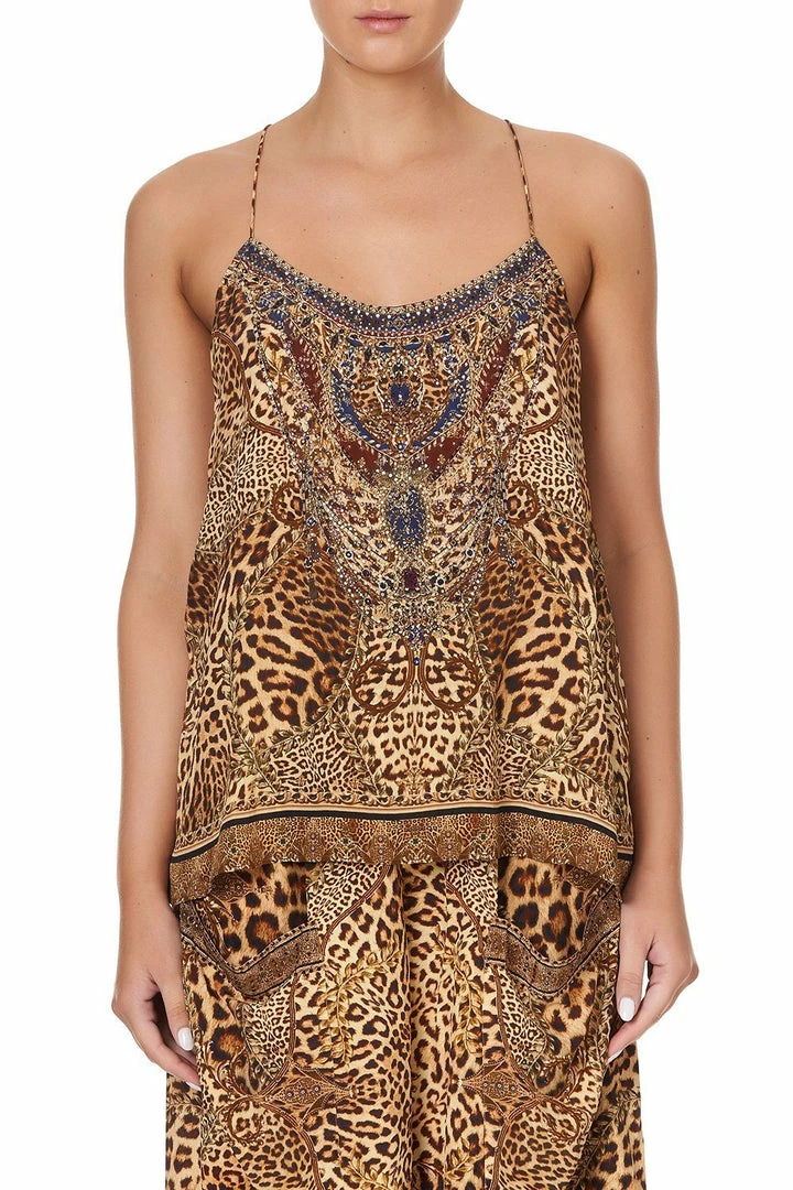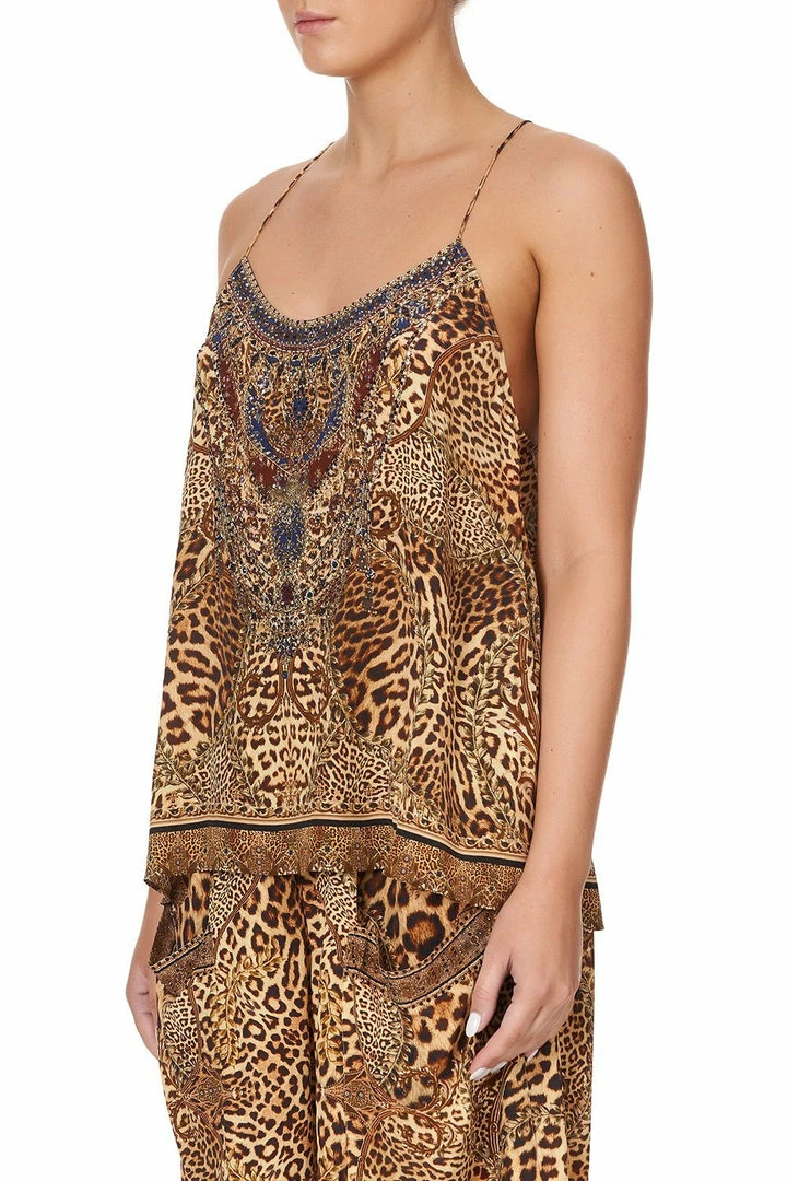 An iconic CAMILLA silhouette reimagined with the story of an unapologetically bold mistress of the manor, the Lady Lodge T Back Shoestring Top is a vivid canvas of leopard print design. Framed with shoestring straps, this pure silk cami style is cut with a flared hem and lavishly decorated with hand-placed CAMILLA crystals. Camouflaged leopards and regal lions punctuate the tonal design, adding a trademark touch of whimsy. Style this silk singlet with jeans and heels for easy casual styling or up-the-ante and pair with the matching Lady Lodge Wide Leg Trouser With Front Pockets.