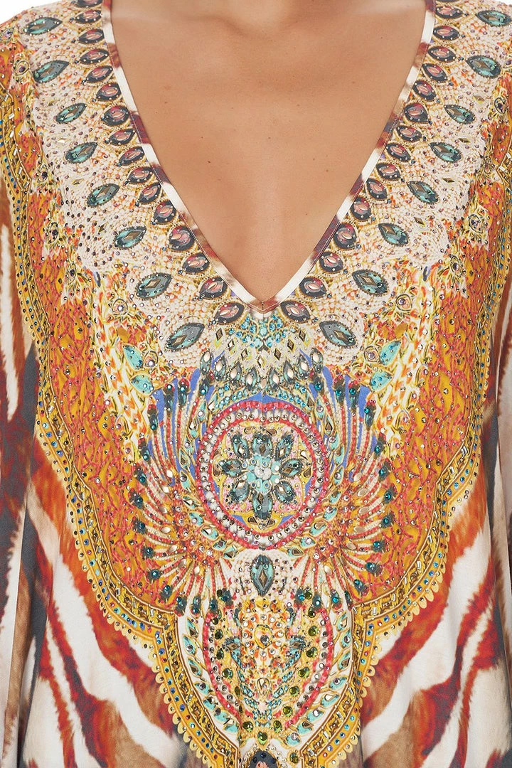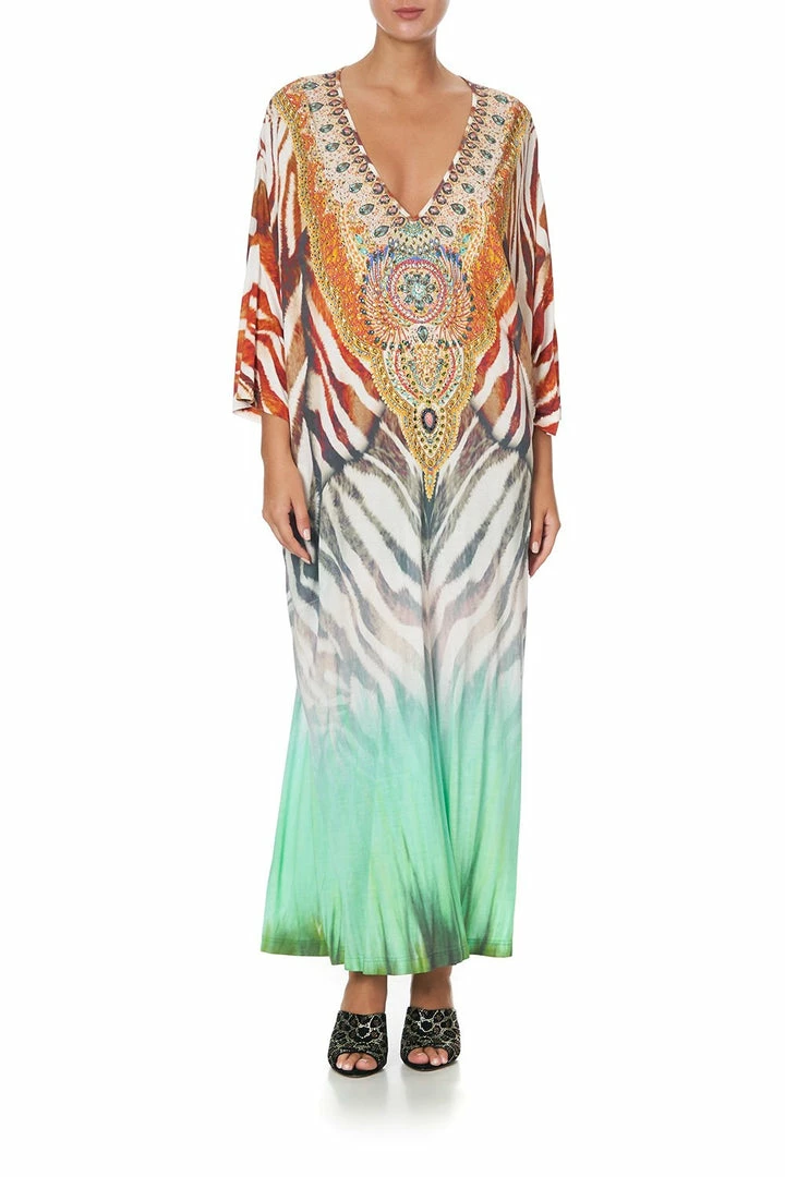 Our decadent summer silhouette is reimagined with the safari heart in mind with the Savannah V Neck Batwing Kaftan. Inspired by the reigning majesties who rule our decadent Mother Earth, we pay homage to the wilds of distant plains. Lush grasslands steal your gaze as they melt into an earthy zebra print and glistening CAMILLA crystals. This luxury kaftan sports a statement sleeve, a deep v-neck that leads into a perfect waist-billow and a relaxed maxi silhouette. Add further definition to the waist by inviting a belt to cinch and shape.