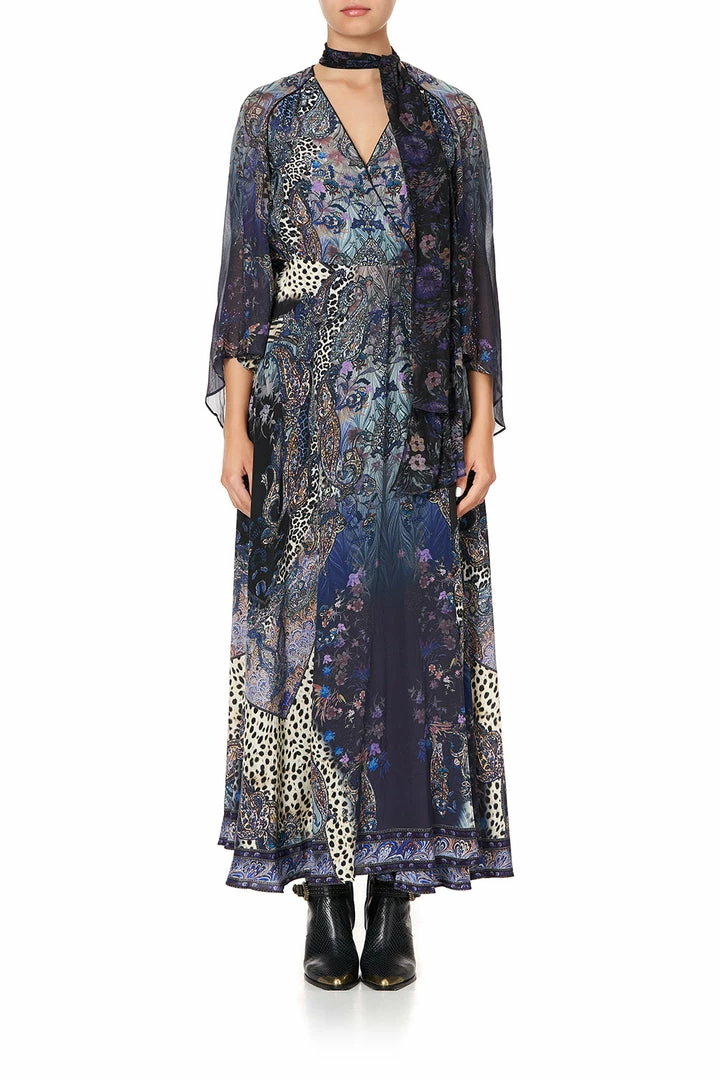 A sweeping formal silk dress enriched with hues on animal print, the Festival Express Wrap Dress With Neck Tie is rebellious and lavish in all form. Delicately hand cut in a printed soft silk enriched with a print inspired by the music of Janis Joplin and her electrifying unbound energy. This free flowing long formal dress features an alluring v neckline, floaty boho sleeves, elevated piping detail, form-fitting elasticated back waist, removable styling scarf and is finished with hand-applied CAMILLA crystals. Pair back with heels and styled with slicked back hair for your next formal event.