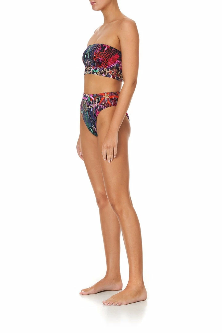 A concoction of golden cascades, the Rocket Woman Reversible High Waist Pant takes inspiration from the glam rock goddesses who made the hyperreal eighties their own. Rich ruby red steals the gaze as cascades of teal and golden detailing swirl opposite panels of vivid animal print and midnight hues. This luxury bikini bottom features a reversible print, signature CAMILLA crystal embellishment, a fitted high-rise silhouette and a cheeky cut. Complete the set with the Reversible Wide Bandeau.