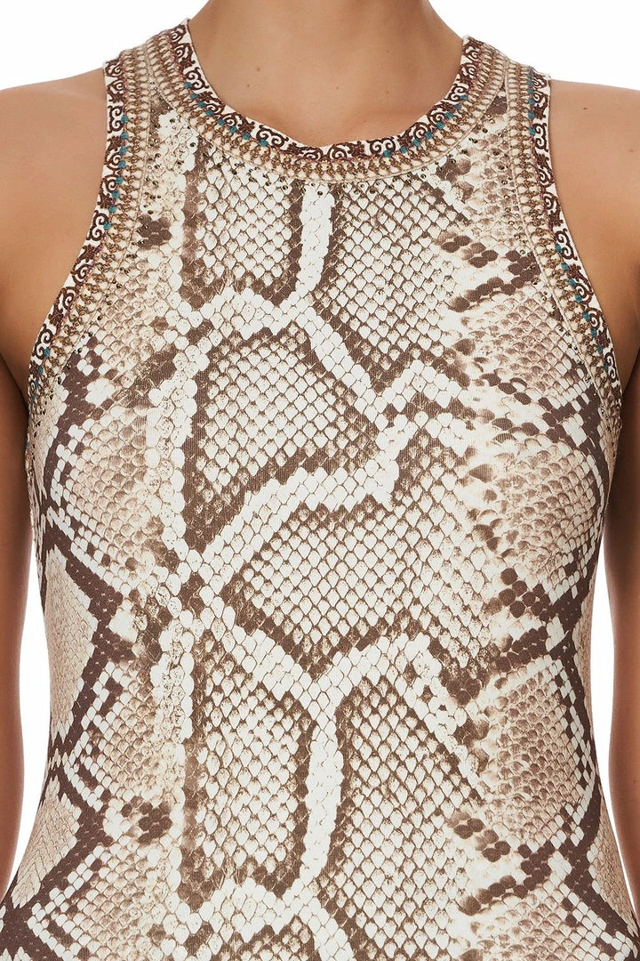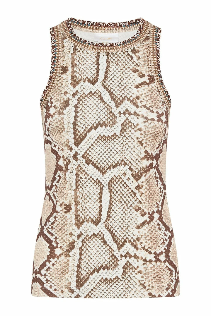 A wild take on the wardrobe essentials, our Gaze Of Medusa Jersey Tank Top is an ode to the reigning majesties that roam our decadent Mother Earth. Crafted from a breathable cotton blend, classic snake print dances in shades of ivory, rich earthy neutrals and warm cedar browns. This luxury summer tank plays host to a fitted silhouette, ribbed detailing at the neckline and arms and signature CAMILLA crystal embellishment. Style with the Jersey Track Short to complete the look.