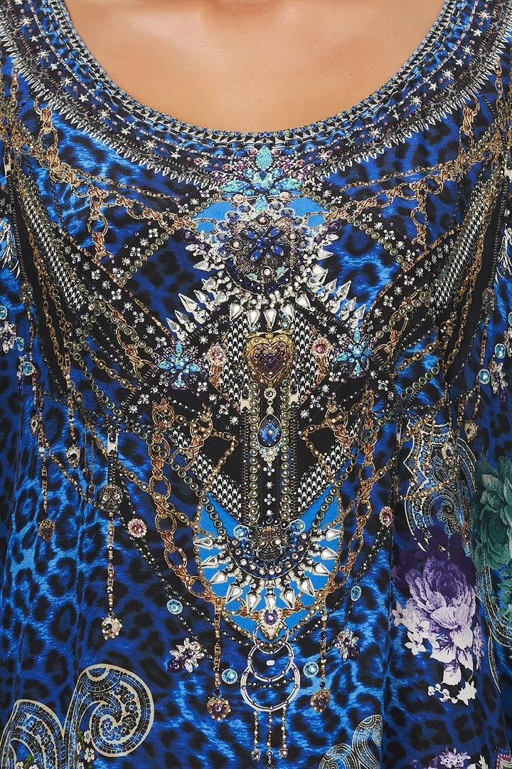 Turning up the volume, the Camden Moon Scoop Back Hem Dress channels the vibrant excess of the colourful characters of Britain’s punk rock scene. Exaggerating every style detail, this statement kaftan dress is adorned with a vibrant electric blue leopard print design, cut in a dramatic scoop back and framed with oversized crystal embellished CAMILLA neckline. Pops of punk weave their way into the paisley accents, with chain, zip and skull motifs all honouring our anarchist inspired muses. Styled in a relaxed fit, this round neck dress is finished with ¾ length sleeves for a versatile multi-wear silhouette. Wear as a dress with statement sandals of tuck into leather trousers for a traditional yet feminine take on the punk aesthetic.
