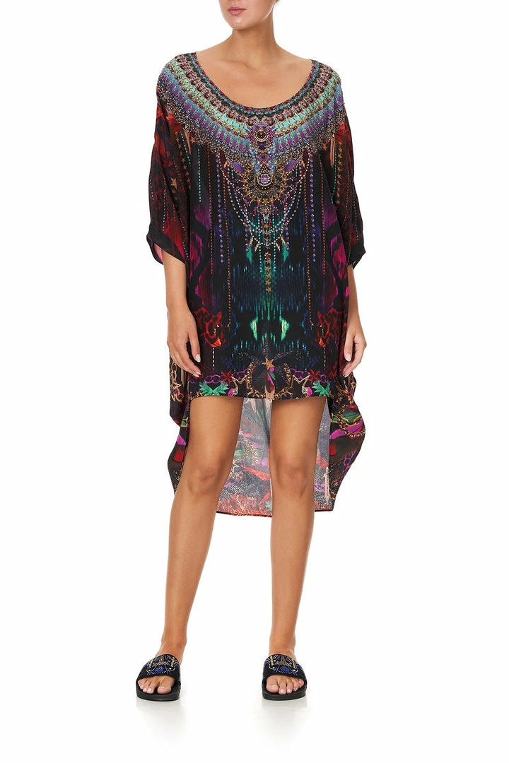 Give the stars a run for their money in the Rocket Woman Scoop Back Hem Dress. In an ode to the glam rock goddesses who defined the eighties, signature CAMILLA crystals shine and adorn the neckline and décolletage in layers of luxury. Shades of midnight meet with mahogany and ruby reds, while electric teal and gold star detail cascades across the silk. This luxury dress sports a cropped length and sleeve, a generous scoop neckline and a relaxed silhouette that leads into a high-low hemline. Style with the Feathered Heel.