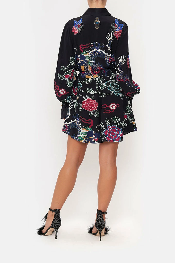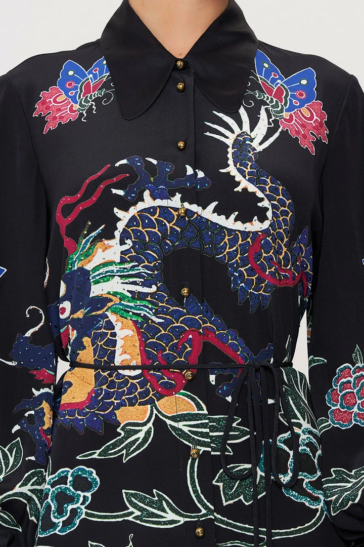 Tailored to the heavens with ancient wonders, the Hollywood Heist Shift Shirt Dress paves the way for cascades of leafy vines, raspberry botanicals and curious dragon eyes upon a sea of midnight hues. Finished with hand-embellished CAMILLA crystals, this luxury silk dress features full blouson sleeves that dance at the wrist, a structured collar, a flared mini hemline, contrast gold button fastening and a relaxed silhouette.