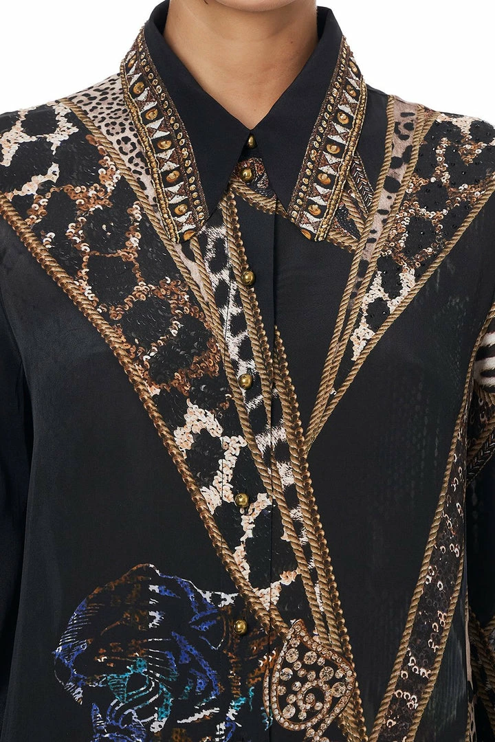 Crafted with a blouson sleeve to steal all gazes, the Lady Stardust Shift Shirt Dress is inspired by the glam rock goddesses who ruled the eighties to the beat of their own drum. Golden cascades greet bronze botanicals, sequin leopard print and wild zebra stripe. This decadent mini dress features a structured collar, gold button fastening, statement blouson sleeves that meet a crystalised cuff and a flared cropped hem. Style with the Feathered Heel for day-to-night wear.
