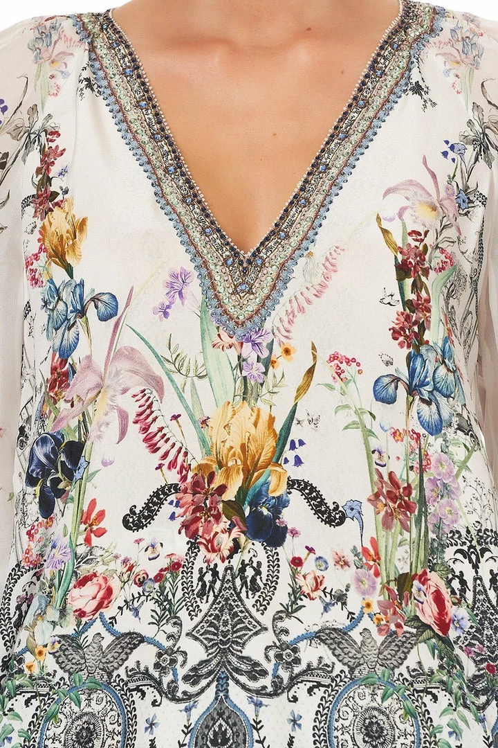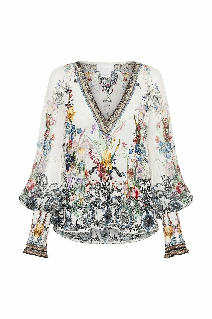 Feel like pure poetry in the True Romance Shirred Cuff Blouse. Romantic inspiration is clear on this lovingly crafted silk piece. Luxurious white provides ample background for a garden of floral blooms. Blouson sleeves are the crown of this long sleeve silk top, enhanced by shirred elastic cuffs and a V neck. This blouse makes a statement when worn with classic trousers or high waisted linen pants but total harmony is acheived when paired with the Romance Is Born Shaped Waist Skirt.