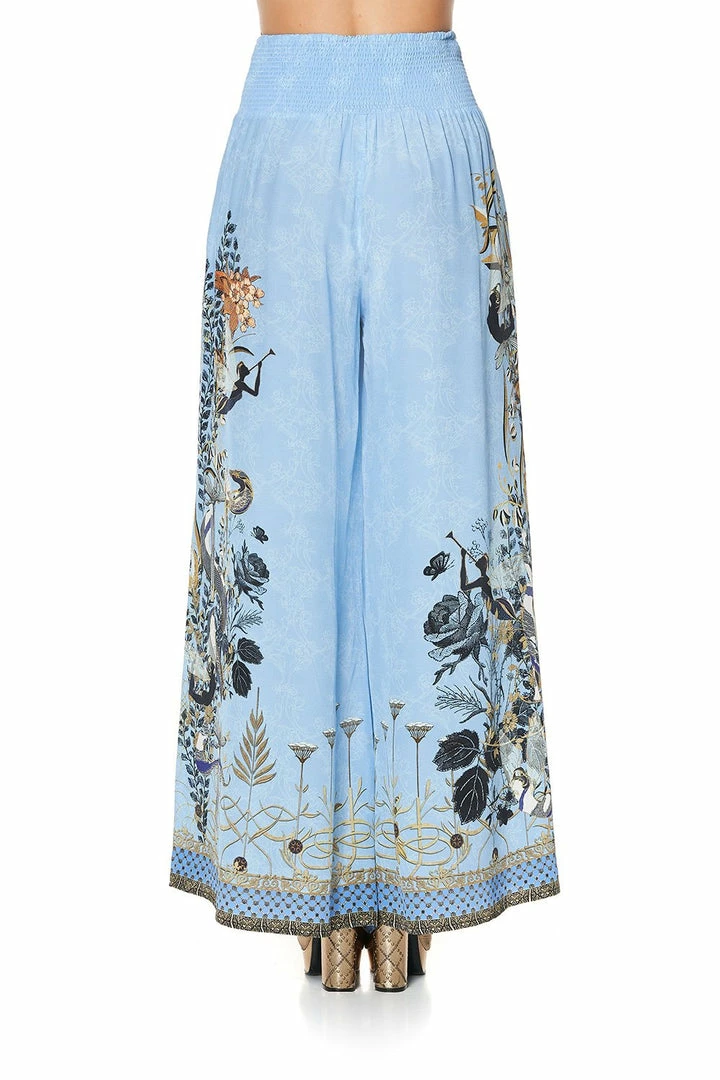 The angelic flow of an airy fairytale print, the Fairy Fountain Shirred Waist Pant is a striking wide leg style that honours the ornate glistening frames amongst its delicate gold features. These silk trousers are crafted in a flared shape providing a relaxed, floor length fit, as well as a flattering elastic back waistband the allows for a stylish high waisted fit. Pair with our chic Fairy Fountain Drawstring Neck Tank to complete this look with divine elegance.