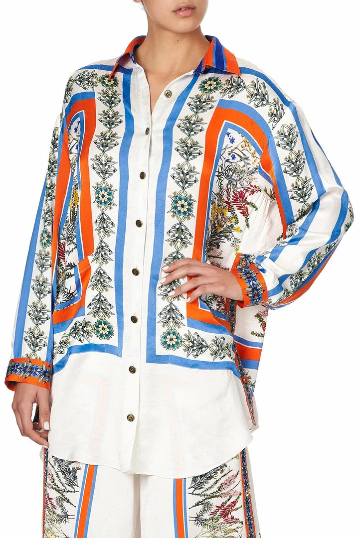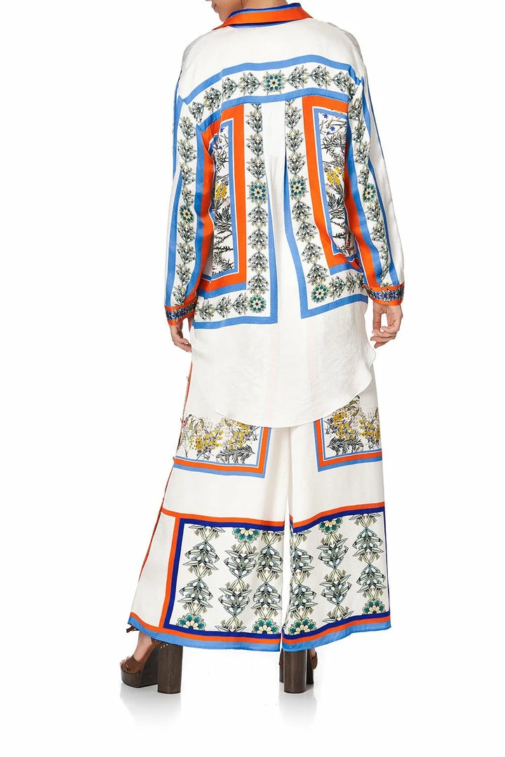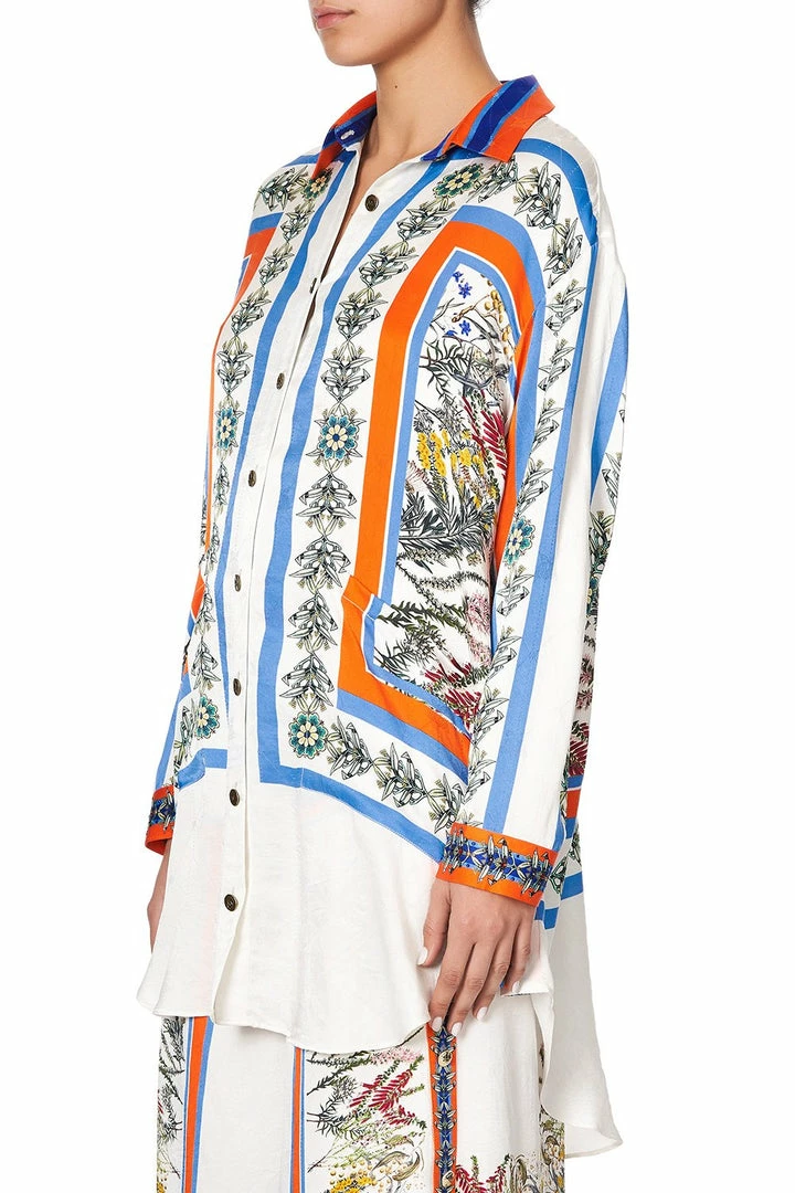 Drawing inspiration from retro beach shacks, the Gone Coast Shirt Tunic with Pockets is a patchwork ode to the gentle energy of the coastline. This silk dress features dropped armholes, practical patch pockets, digitally printed silk, as well as hand-placed crystals as detail.