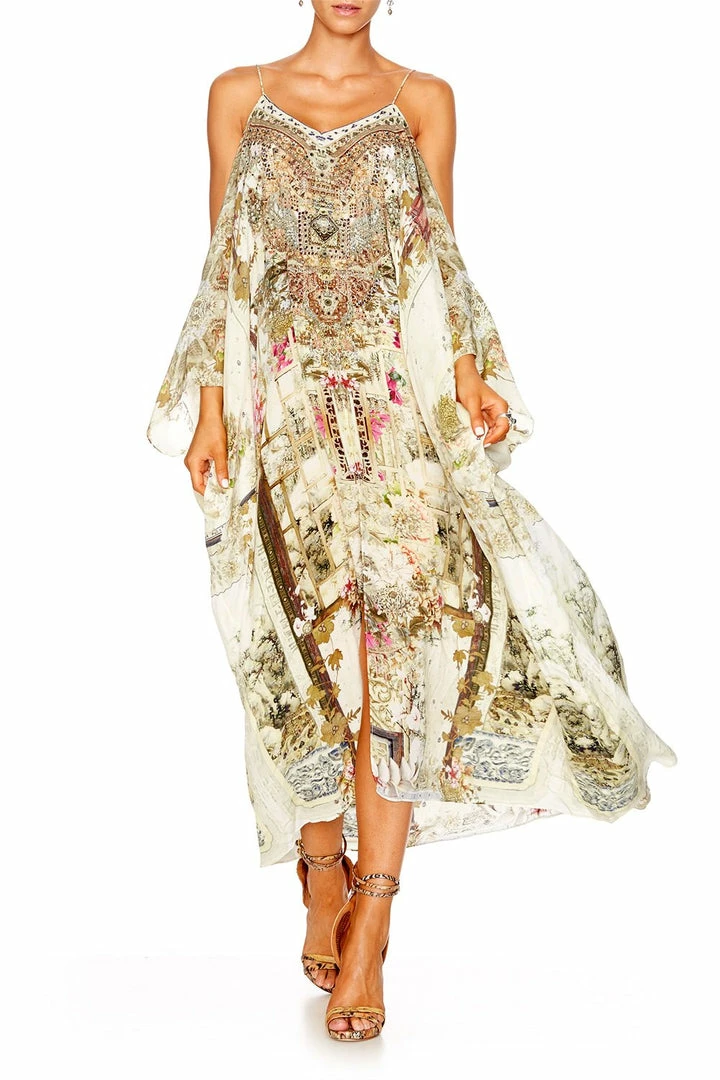 Bright and beautiful, floral and feminine; the Girl In The Garden Shoestring Strap Kaftan combines elegant patterning with a capacious, oversized silhouette. Inspired by the secret gardens of China, this striking piece features a billowing cut, shoestring straps and a split to centre front and sleeves. Wear yours over your favourite one piece or bikini for a bohoemain beachside look, or team with a belt to cinch in the waist and couple with strappy heels for an effortlessly elegant luxury resort wear ensemble.