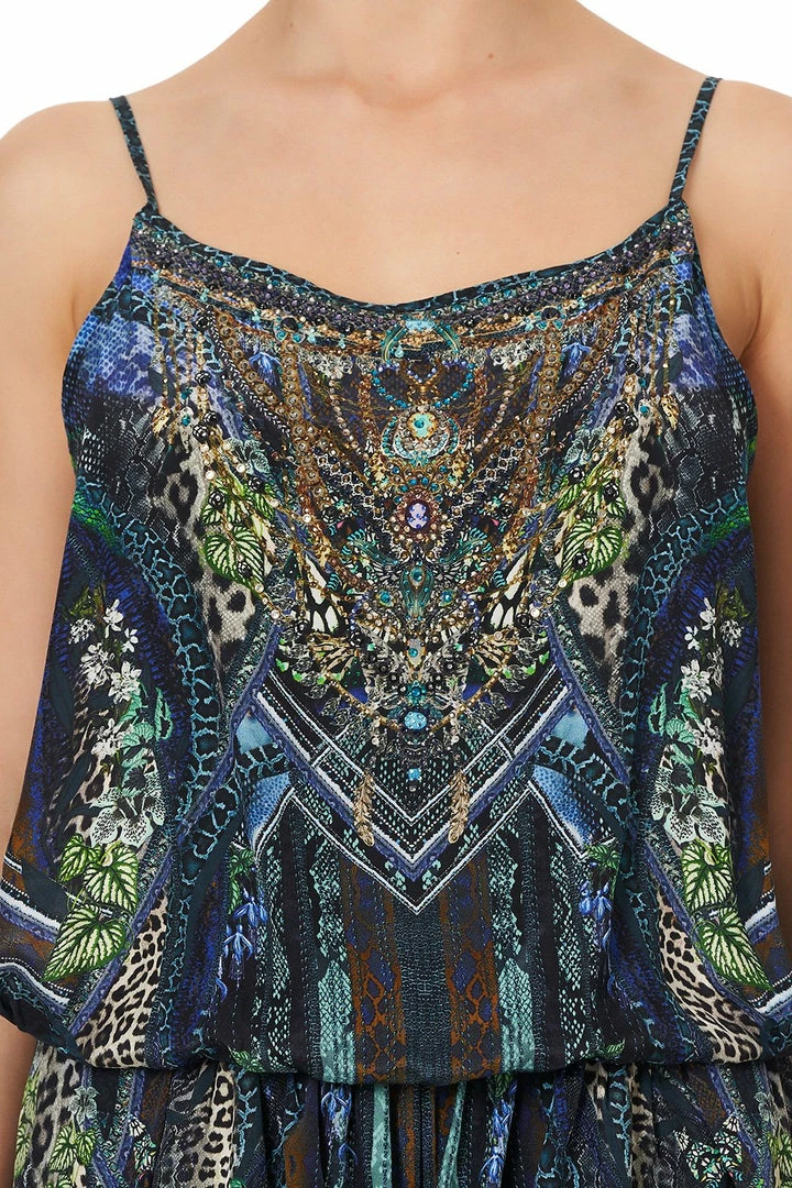 A celebrated CAMILLA summer silhouette reimagined with a new season print; the Komodo Queen Shoestring Strap Playsuit is reminiscent of a zoologist by the name of Joan and her lifelong dedication to protecting the Komodo dragon. This mini-style playsuit features a comfortable elasticated waist for free-movement, a billowing front overlay, a back-waist tie for added form and is finished with hand-applied CAMILLA crystal embellishments as detail. A piece to wear for all day and all night dancing, pair with biker boots for festivals or with heels for summer parties.